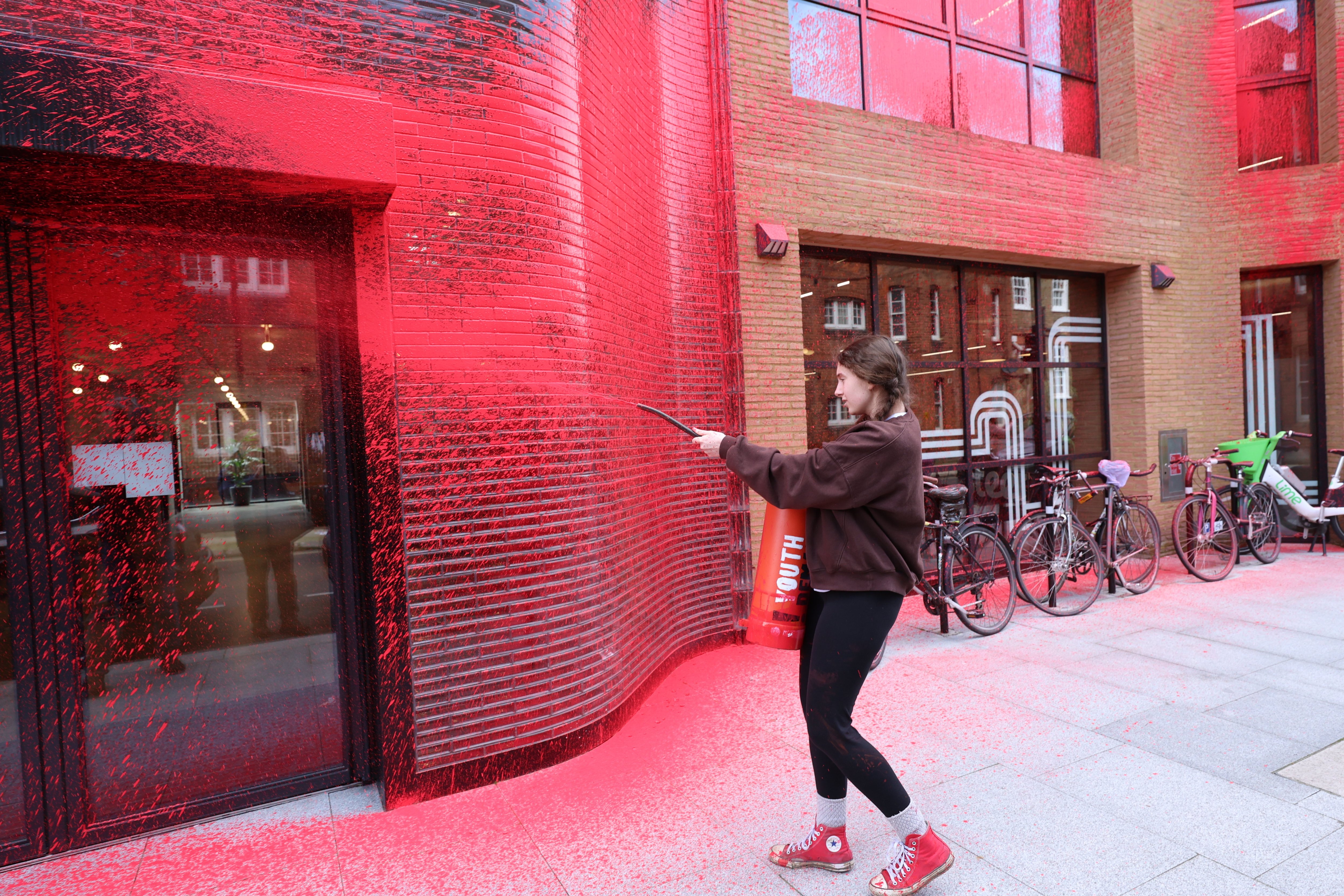 An activist from Youth Demand attacks the Labour party headquarters in London on April 7, 2024. The campaign group is calling for action to curb climate change and for the end of arms sales to Israel. (Photo by Tom Bowles/The Times)