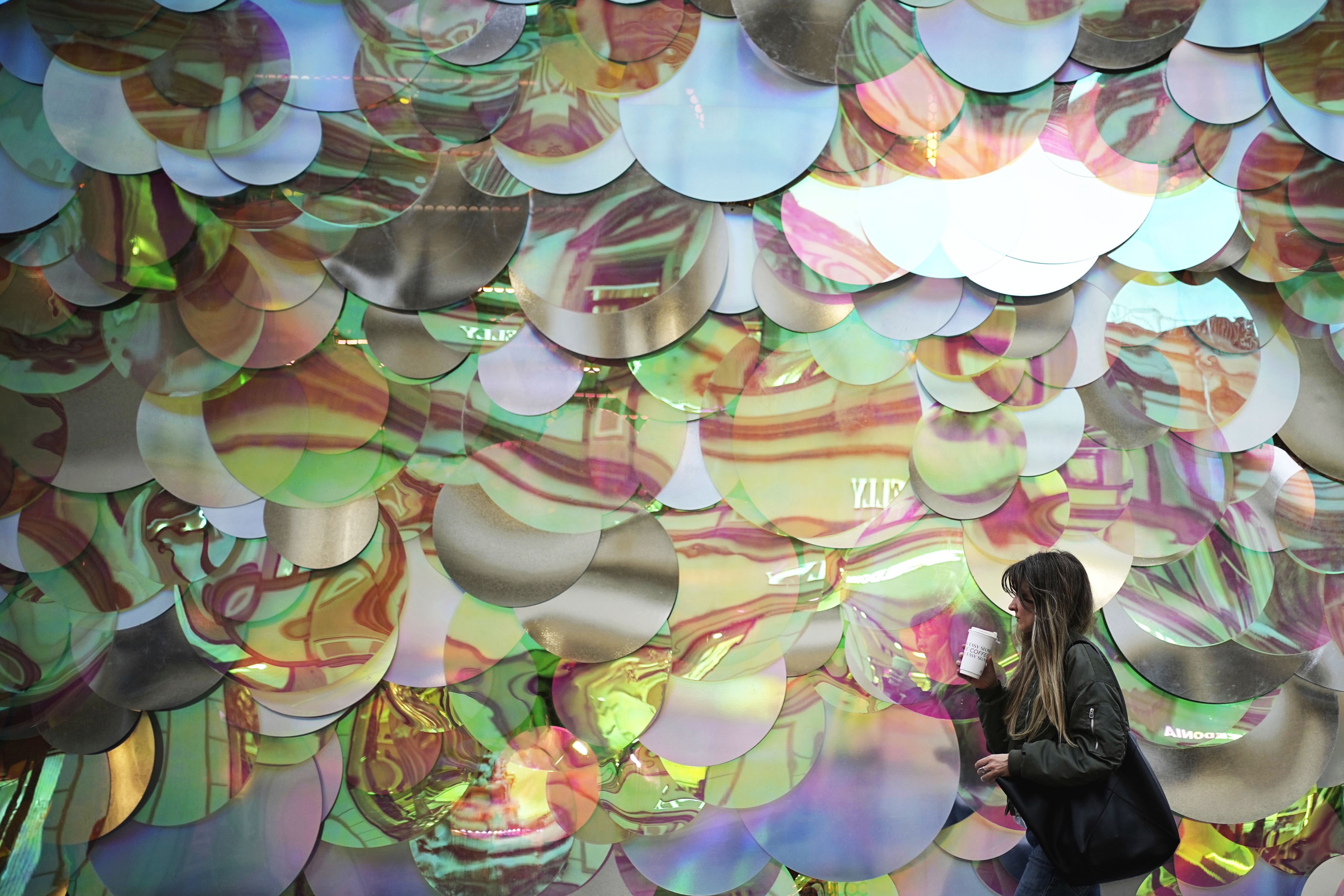 A woman walks by a temporary shopping pavilion decorated with giant sequins in Moscow, Wednesday, July 2, 2025. (Photo by Pavel Bednyakov/AP Photo)