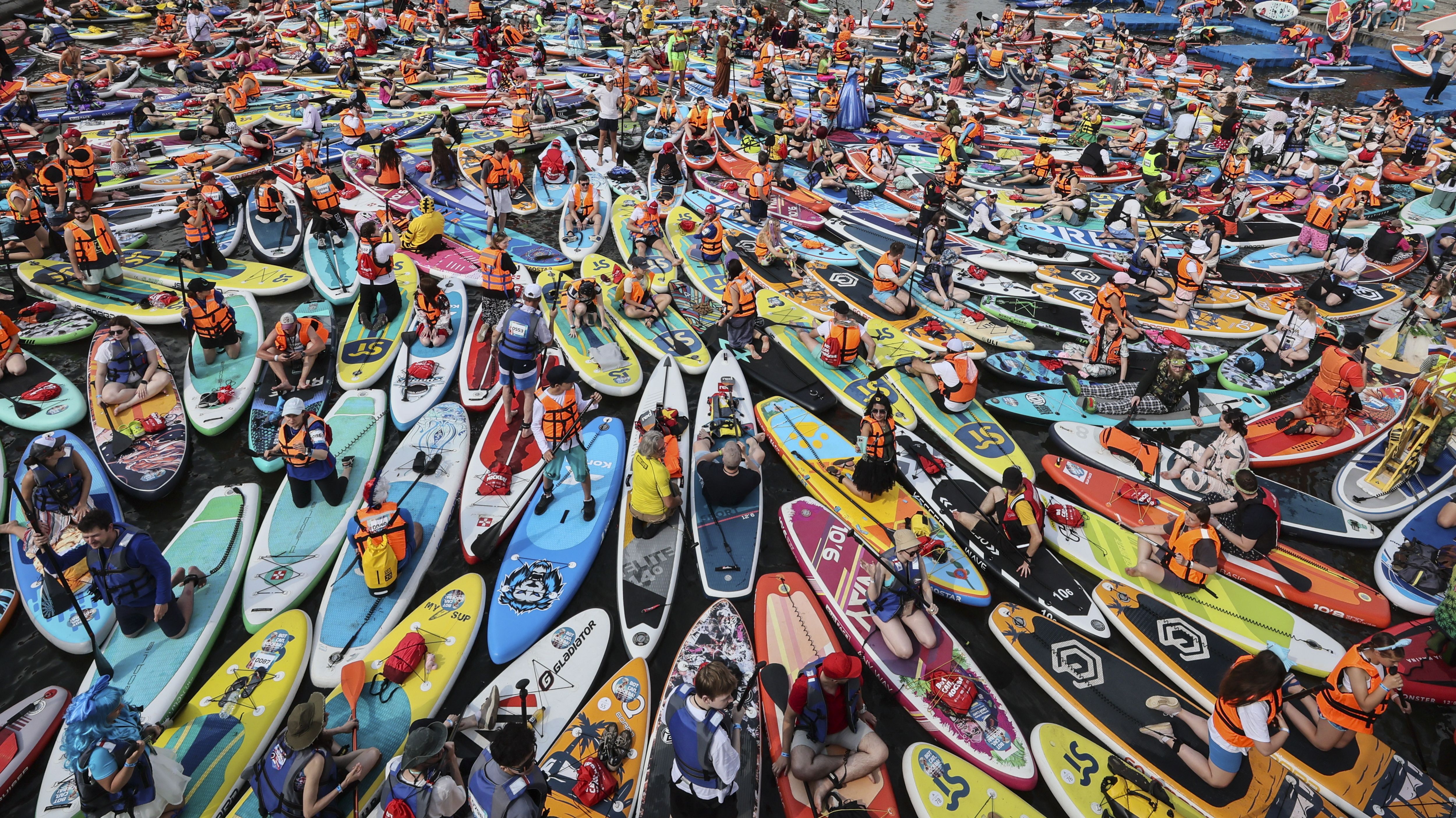 People attend a large-scale costumed Stand Up Paddleboarding (SUP) festival on the Moskva River in Moscow, Russia, 13 July 2025. (Photo by Yuri Kochetkov/EPA)