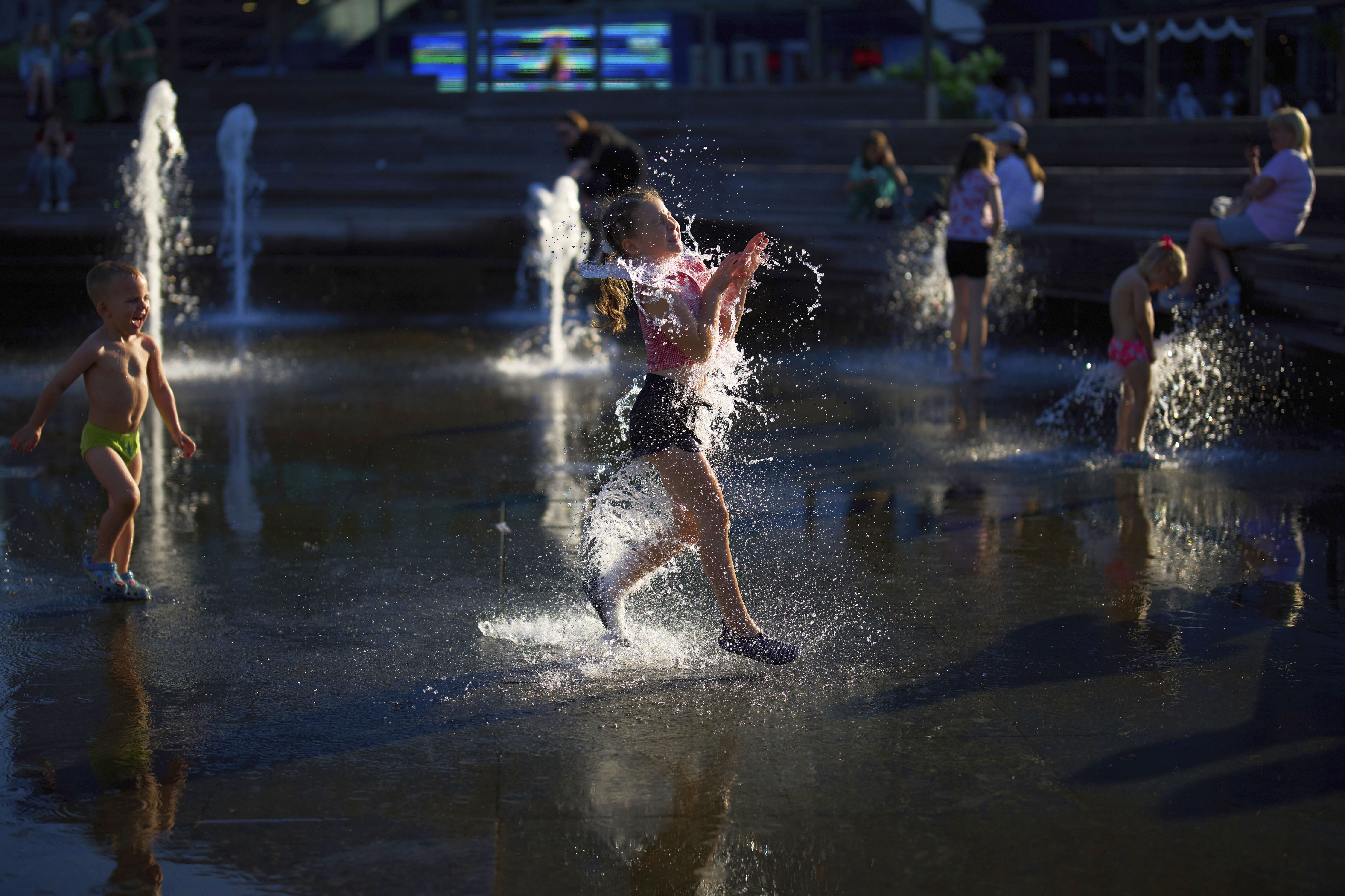 Children cools off in a fountain at VDNKh (The Exhibition of Achievements of National Economy) enjoying the warm weather during sunset in Moscow, Friday, July 25, 2025. (Photo by Alexander Zemlianichenko/AP Photo)