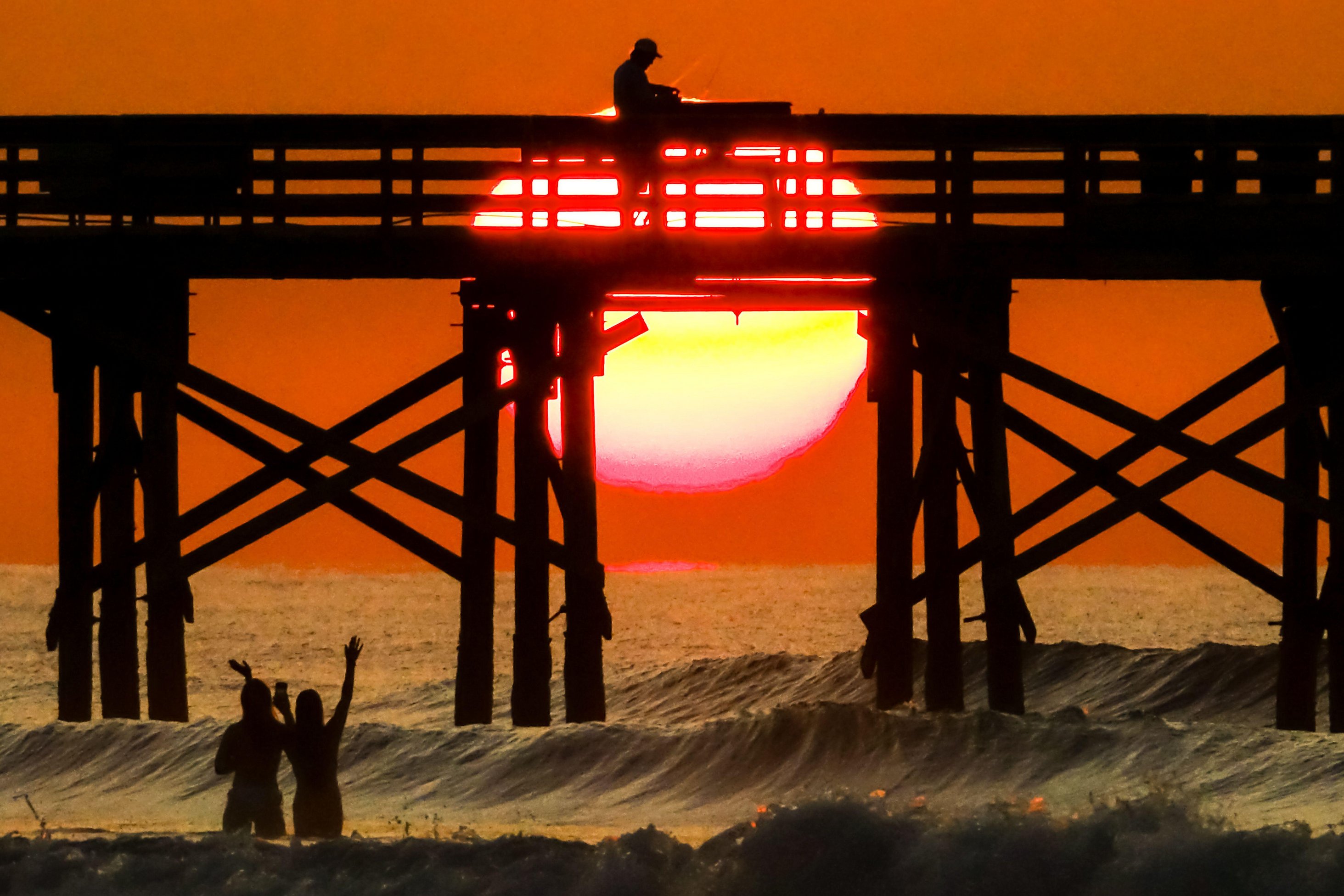 A man fishes from the Isle of Palms pier as young girls record a video silhouetted by the sunrise over the Atlantic Ocean along Front Beach, August 18, 2025 in Isle of Palms, South Carolina. High waves and potential storm serge is expected later in the week as Hurricane Erin, a category 4 storm passes off the coast. High waves and potential storm serge is expected later in the week as Hurricane Erin, a category 4 storm passes off the coast. (Photo by Richard Ellis/Alamy Live News)
