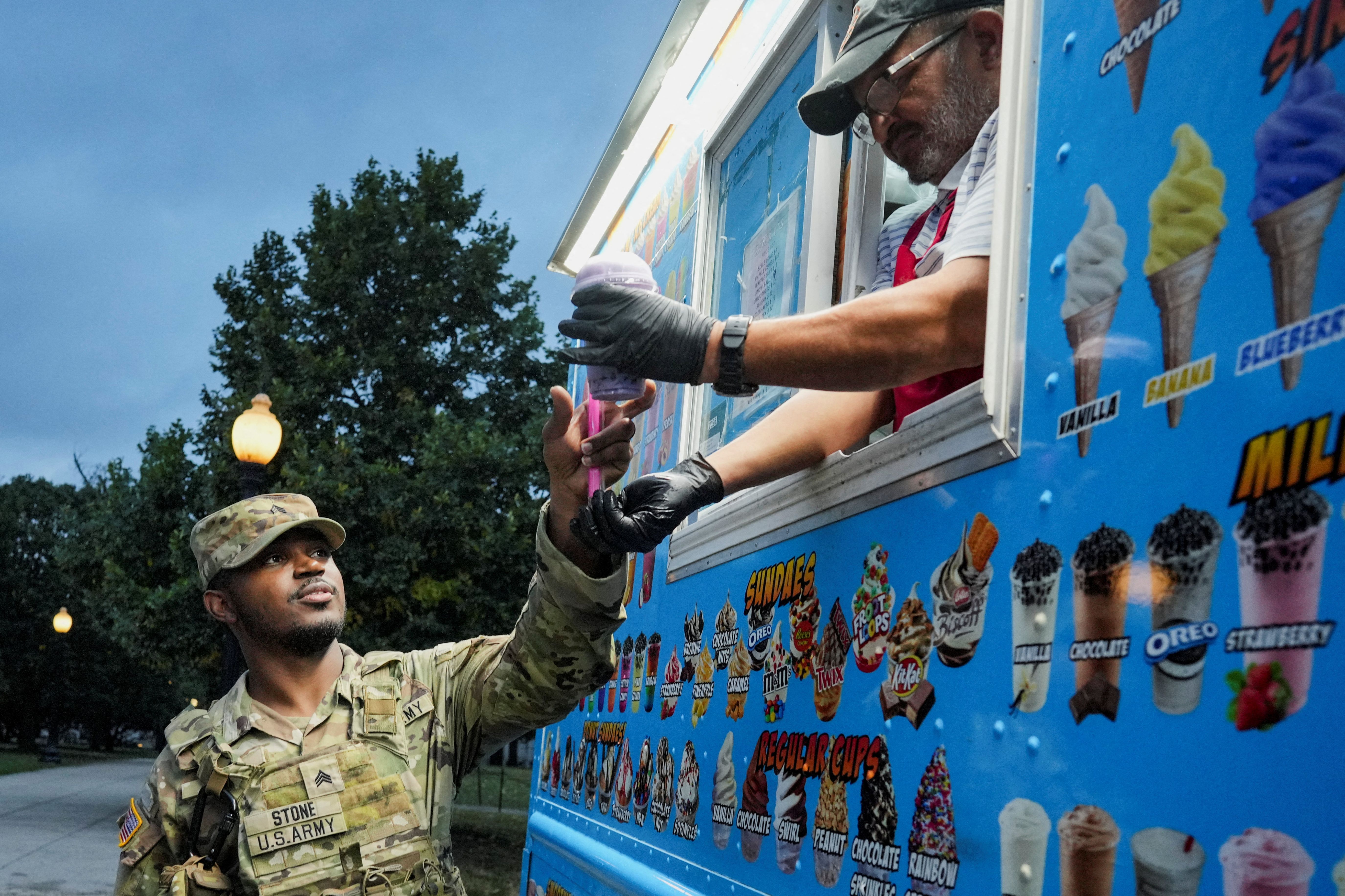 A member of the National Guard gets ice cream during a break at the National Mall in Washington on August 18, 2025. (Photo by Ken Cedeno/Reuters)
