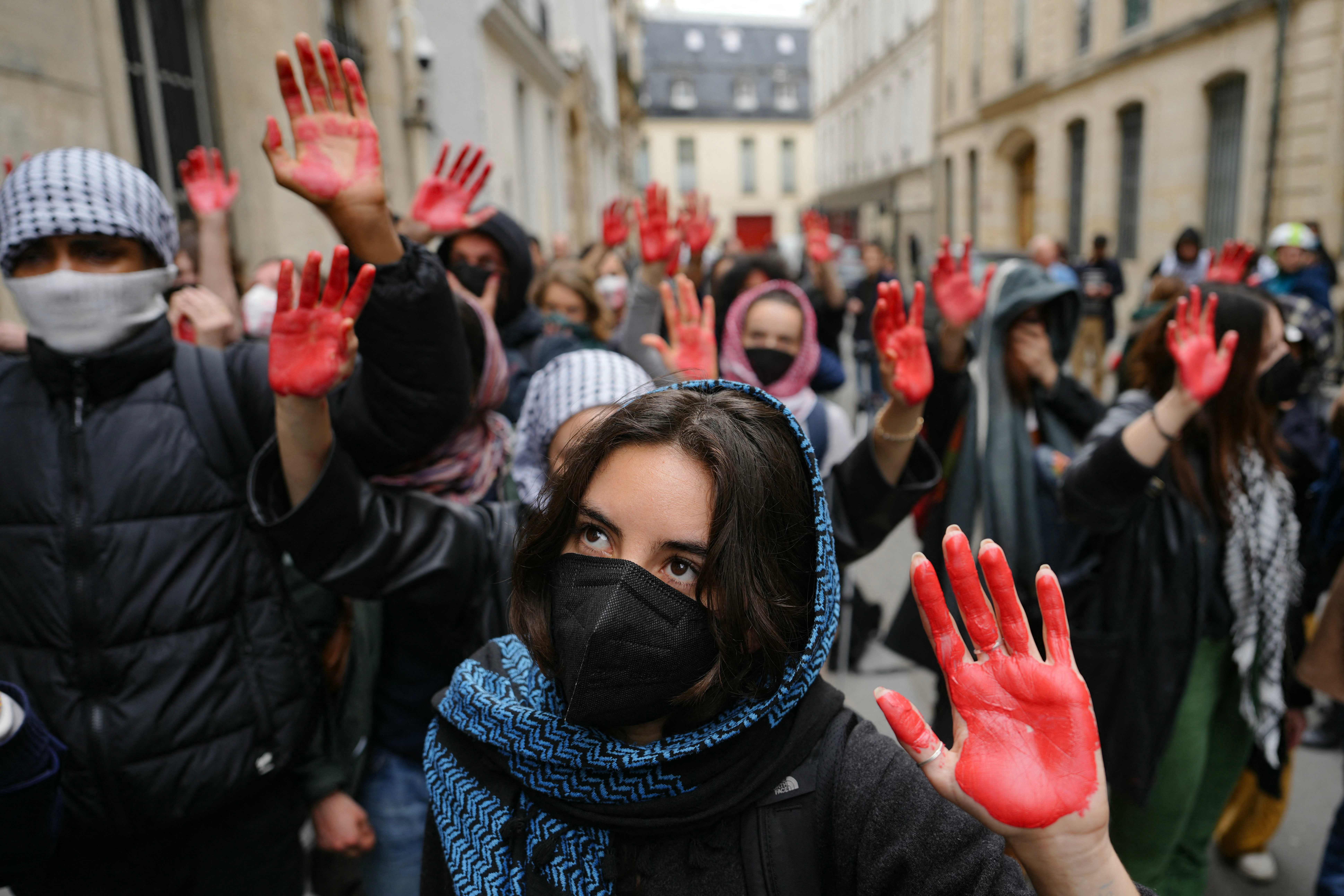 Protesters display mock blood on their hands as they take part in a demonstration in front of the Institute of Political Studies (Sciences Po Paris) occupied by students, in support of Palestinians, in Paris on April 26, 2024. A few dozen students stay mobilized in support of Palestinians occupying a new building at Sciences Po Paris since April 25, 2024, evening, the day after police evacuated another of the school's sites, in the wake of actions at American universities. (Photo by Dimitar Dilkoff/AFP Photo)