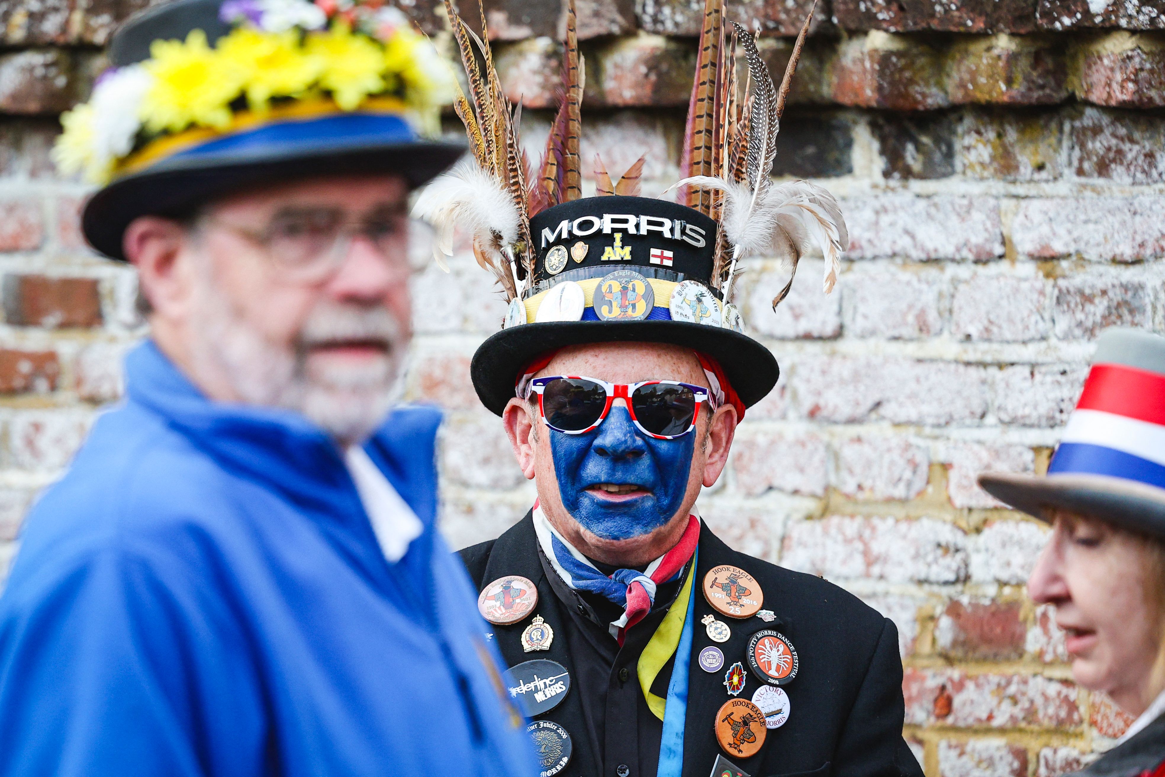 Morris Dancers gather at The Bell in the Bury pub to celebrate St George's Day in Odiham on April 23, 2024. Hampshire's oldest Border Tradition Morris Dancing team, The Hook Eagle Morris Men were joined by teams Berkshire Bedlam, Basingclog Morris, Mayflower Morris, Pilgrim Morris, Fleet Morris and Yateley Morris Men for a St George's Day walking tour of the Inns of Odiham (Photo by Adrian Dennis/AFP Photo)