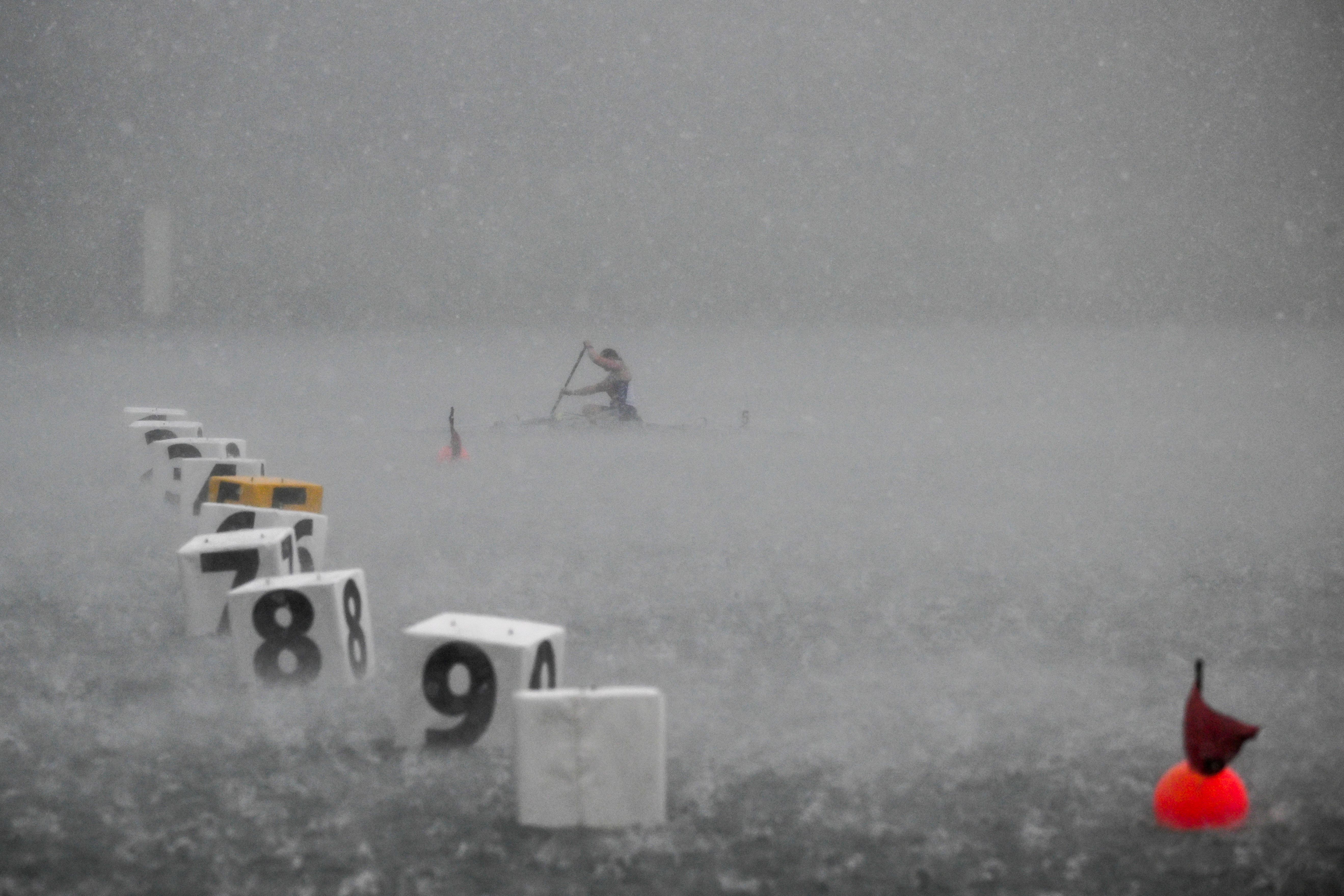 A canoeist competes during a hailstorm at the ICF Canoe Sprint World Championships in Milan, Italy, 21 August 2025. (Photo by Zsolt Czeglédi/EPA)