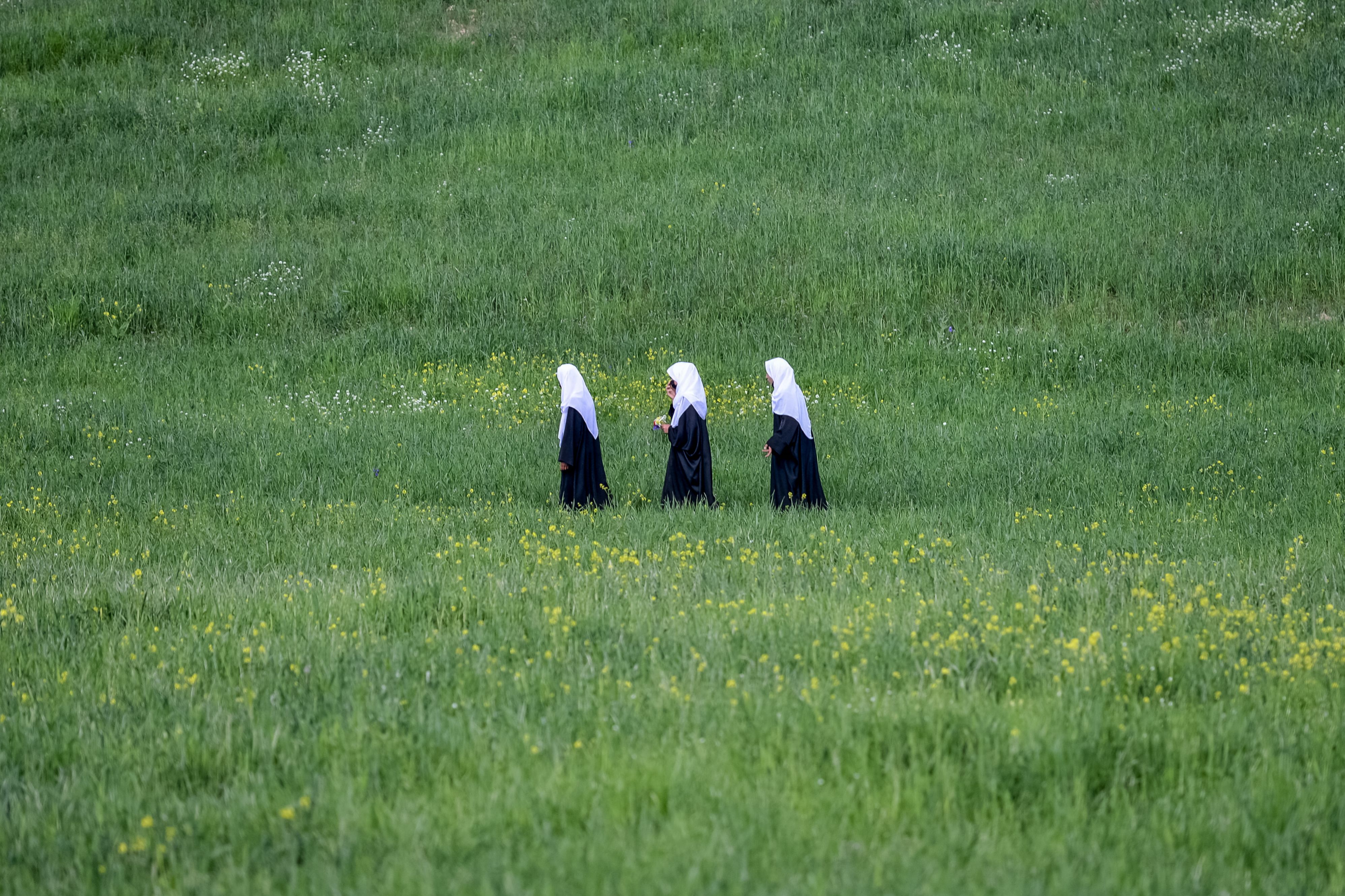 Afghan school girls walk through a field in Fayzabad district of Badakhshan Province on April 22, 2025. (Photo by Omer Abrar/AFP Photo)