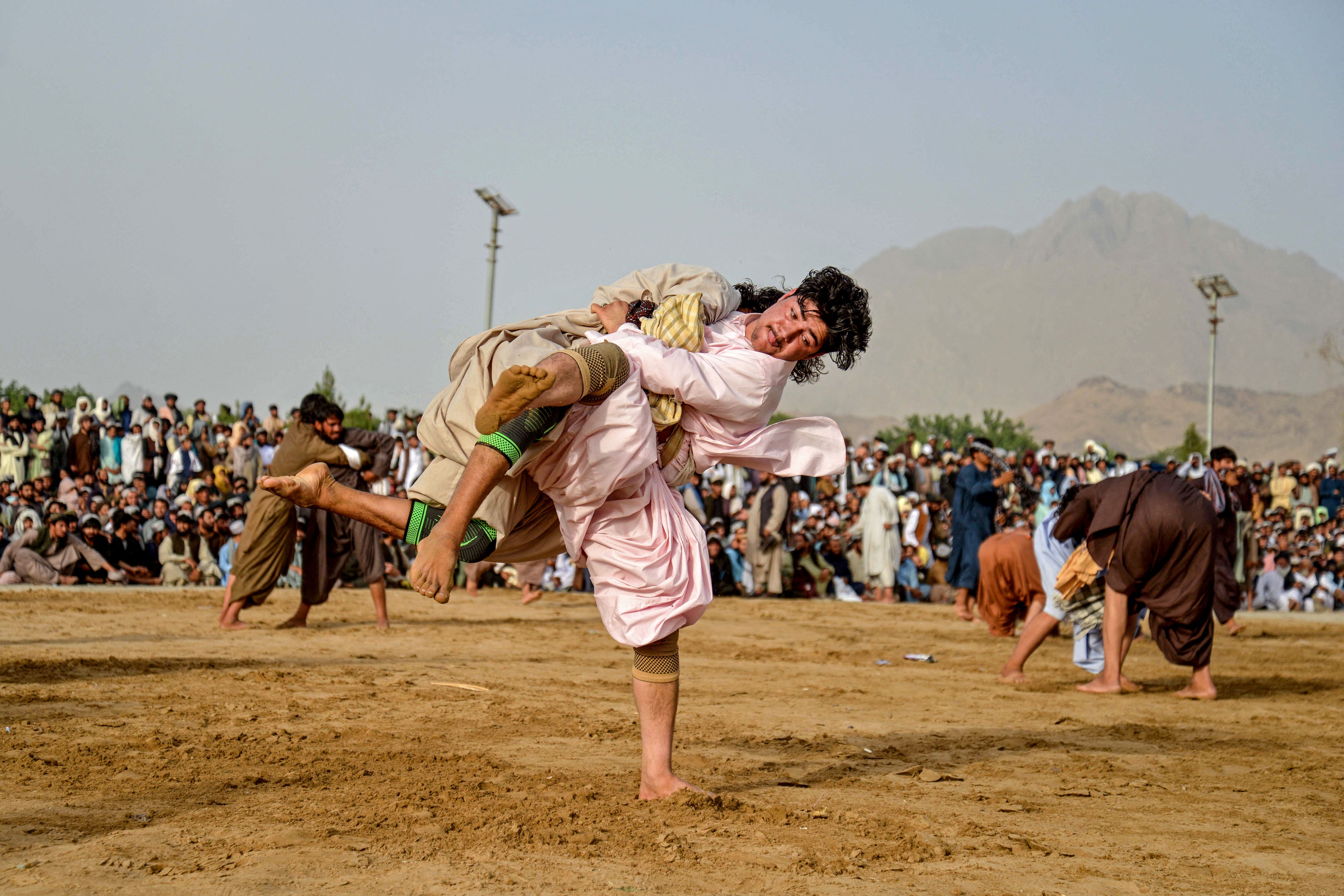 Afghan wrestlers compete during a traditional wrestling competition at a field in Arghandab district of Kandahar province on May 8, 2025. (Photo by Sanaullah Seiam/AFP Photo)