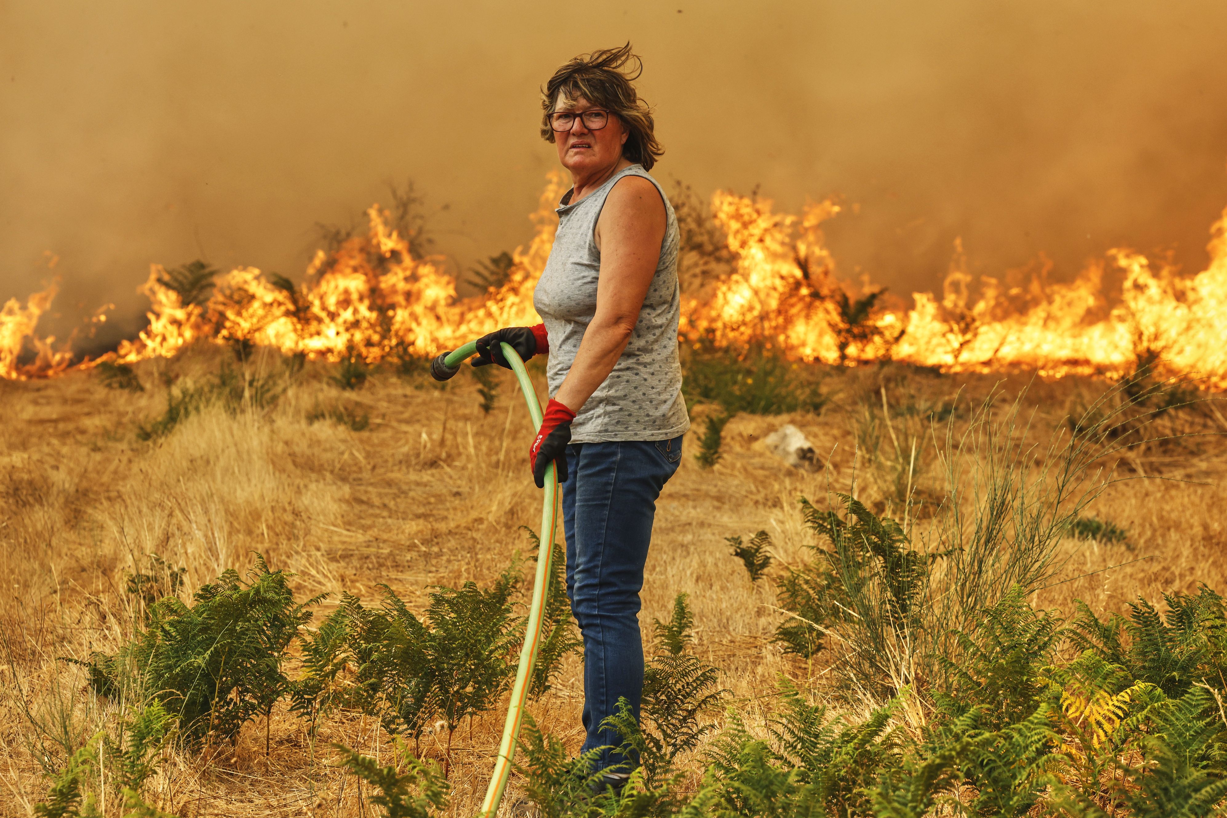 A woman with a hose tries to put out the fire during a wildfire in Santa Baia De Montes, northwestern Spain, Thursday, August 14, 2025. (Photo by Lalo R. Villar/AP Photo)