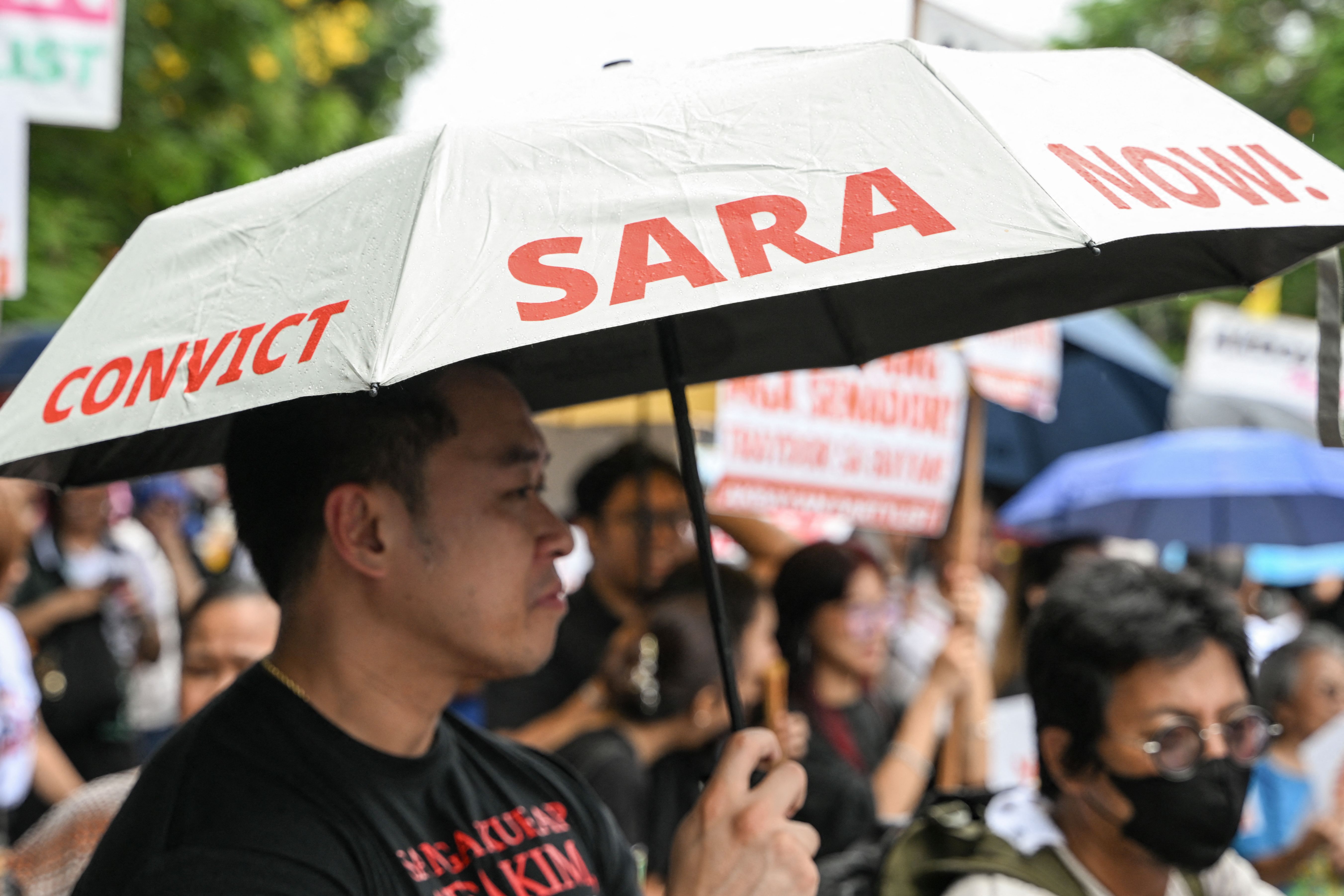A man holds an umbrella reading “Convict Sara Now!” as people gather to protest following the Senate's decision on the impeachment trial of Philippine Vice President Sara Duterte, outside the Senate of the Philippines in Pasay, Metro Manila on June 11, 2025. House of Representatives prosecutors said on June 11 that Philippine Vice President Sara Duterte's impeachment trial could not be stopped despite the Senate sending the case back to them hours after convening as a court. (Photo by Jam Sta Rosa/AFP Photo)