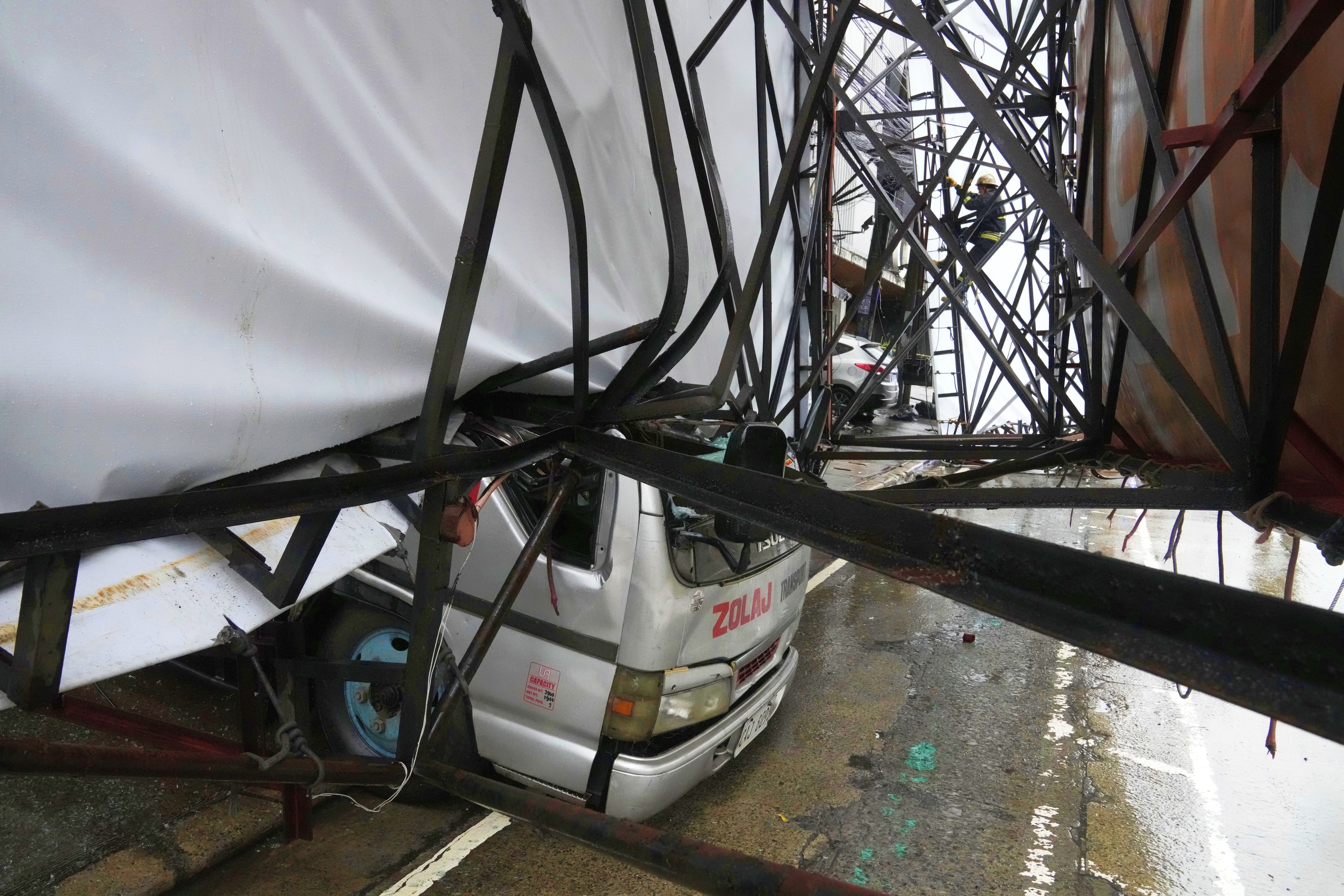 A rescue worker climbs a toppled billboard that damaged a parked truck in Quezon city, Philippines due to enhanced winds and rain as Tropical Storm Wipha, locally called Crising, exits the northern portion of country on Saturday, July 19, 2025. (Photo by Aaron Favila/AP Photo)
