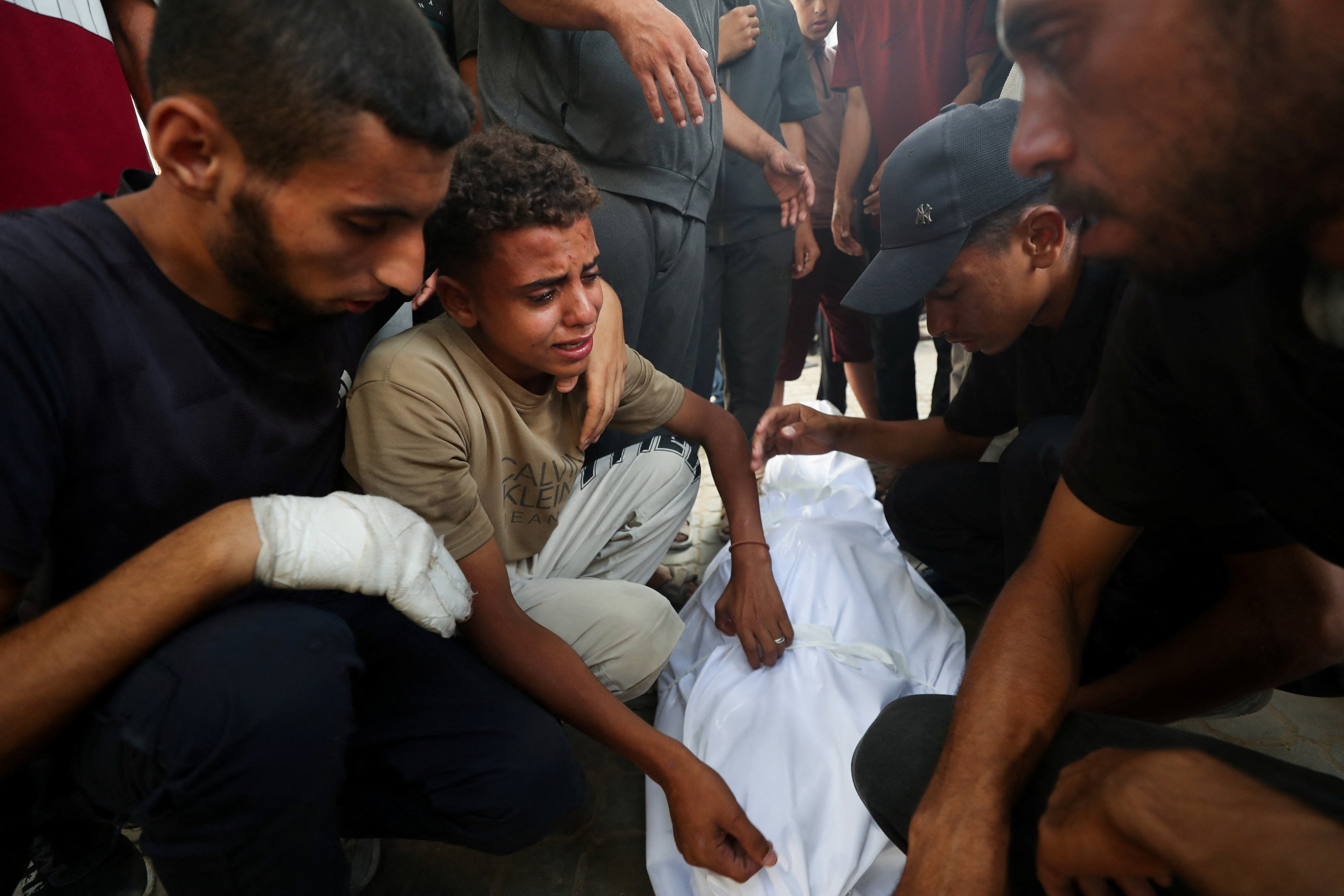 Mourners attend the funeral of Palestinians, who were killed by Israeli fire while trying to receive aid on Tuesday, according to medics, at Al-Shifa Hospital, in Gaza City, on July 30, 2025. (Photo by Mahmoud Issa/Reuters)