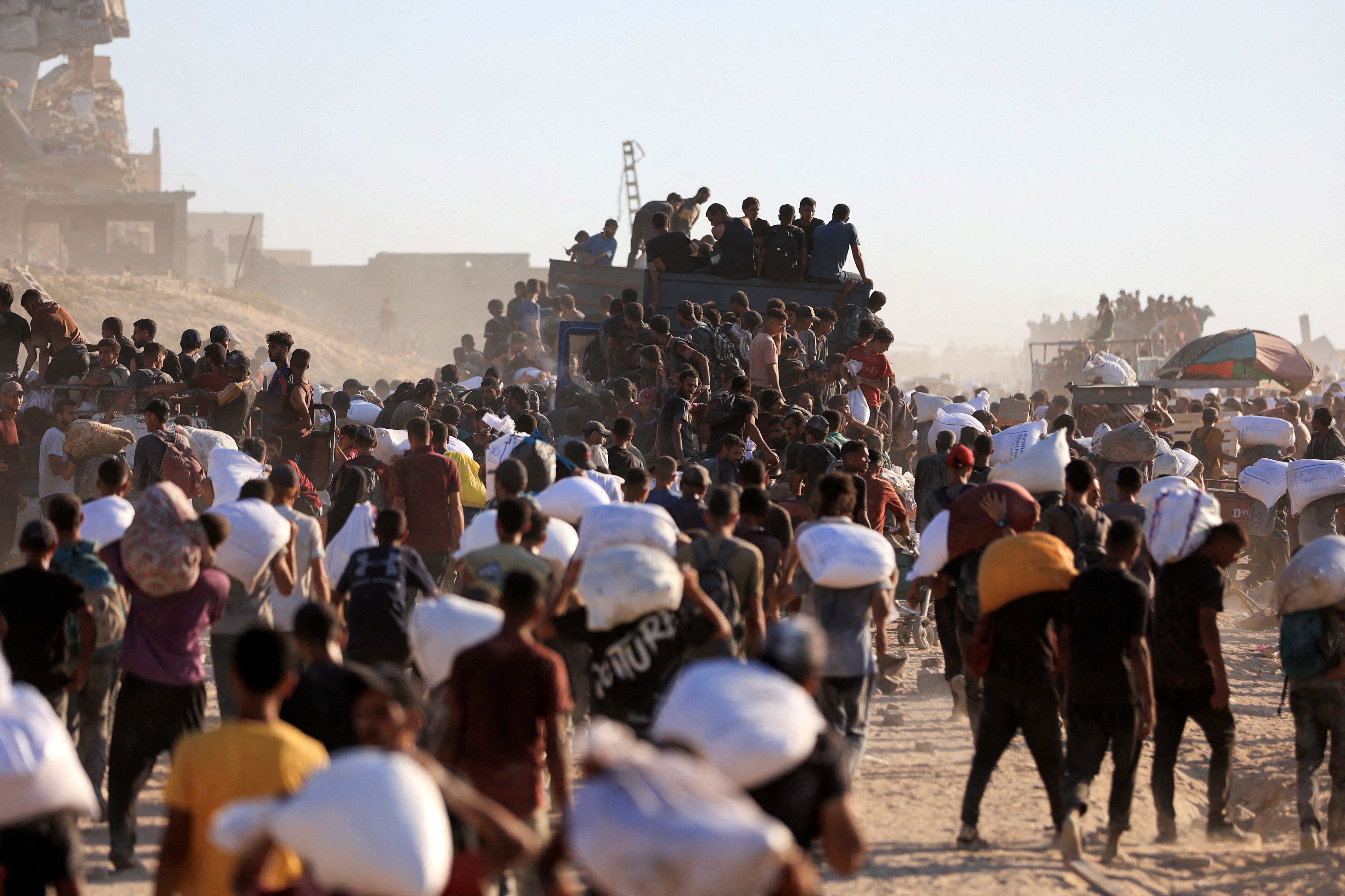 Palestinians carry aid supplies that entered Gaza through Israel, in Beit Lahia in the northern Gaza Strip on July 30, 2025. (Photo by Dawoud Abu Alkas/Reuters)