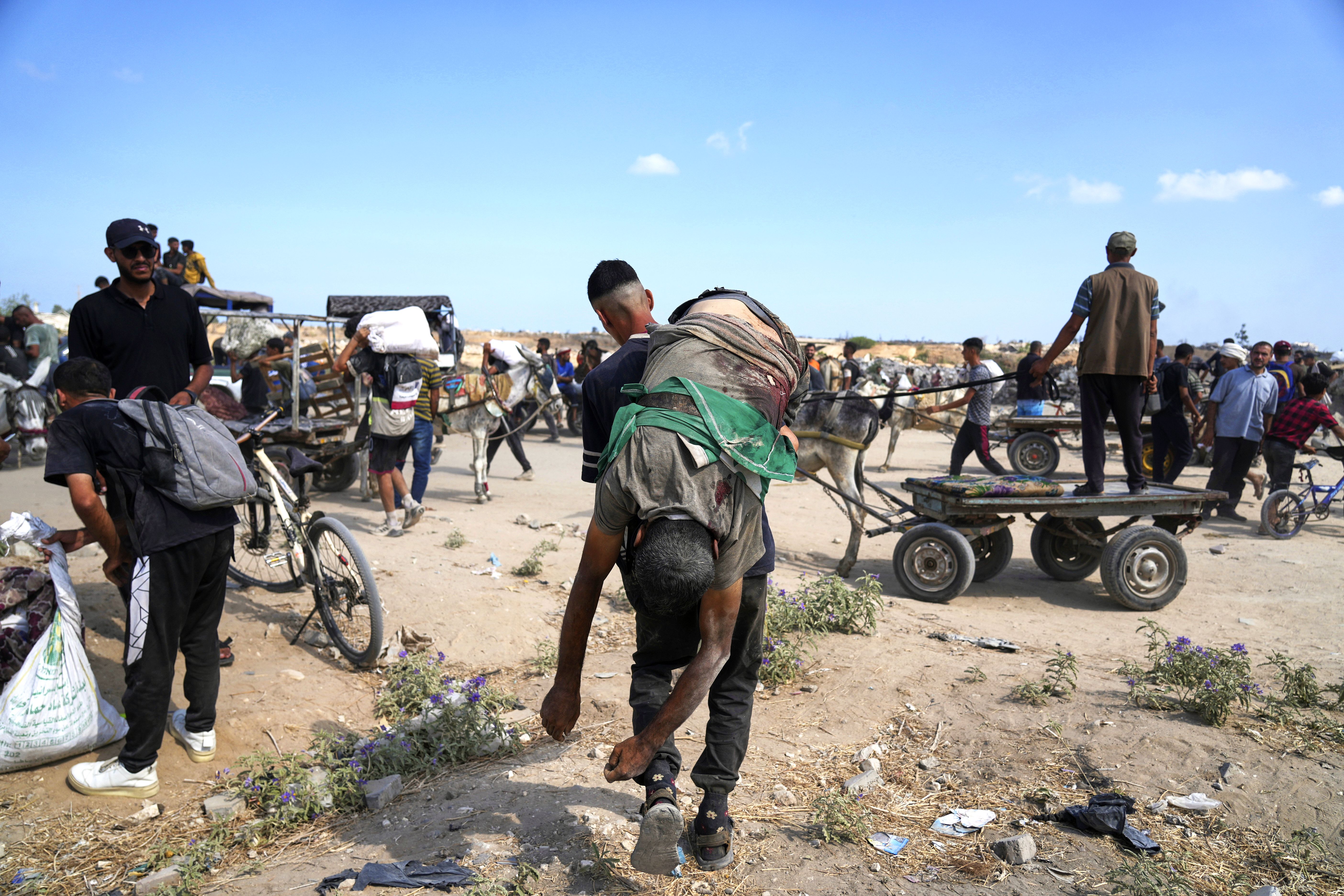 A Palestinian carries the body of a man killed while trying to receive aid near a distribution center operated by the U.S.-backed Gaza Humanitarian Foundation (GHF) in Netzarim, in the Gaza Strip, August 4, 2025. (Photo by Abdel Kareem Hana/AP Photo)