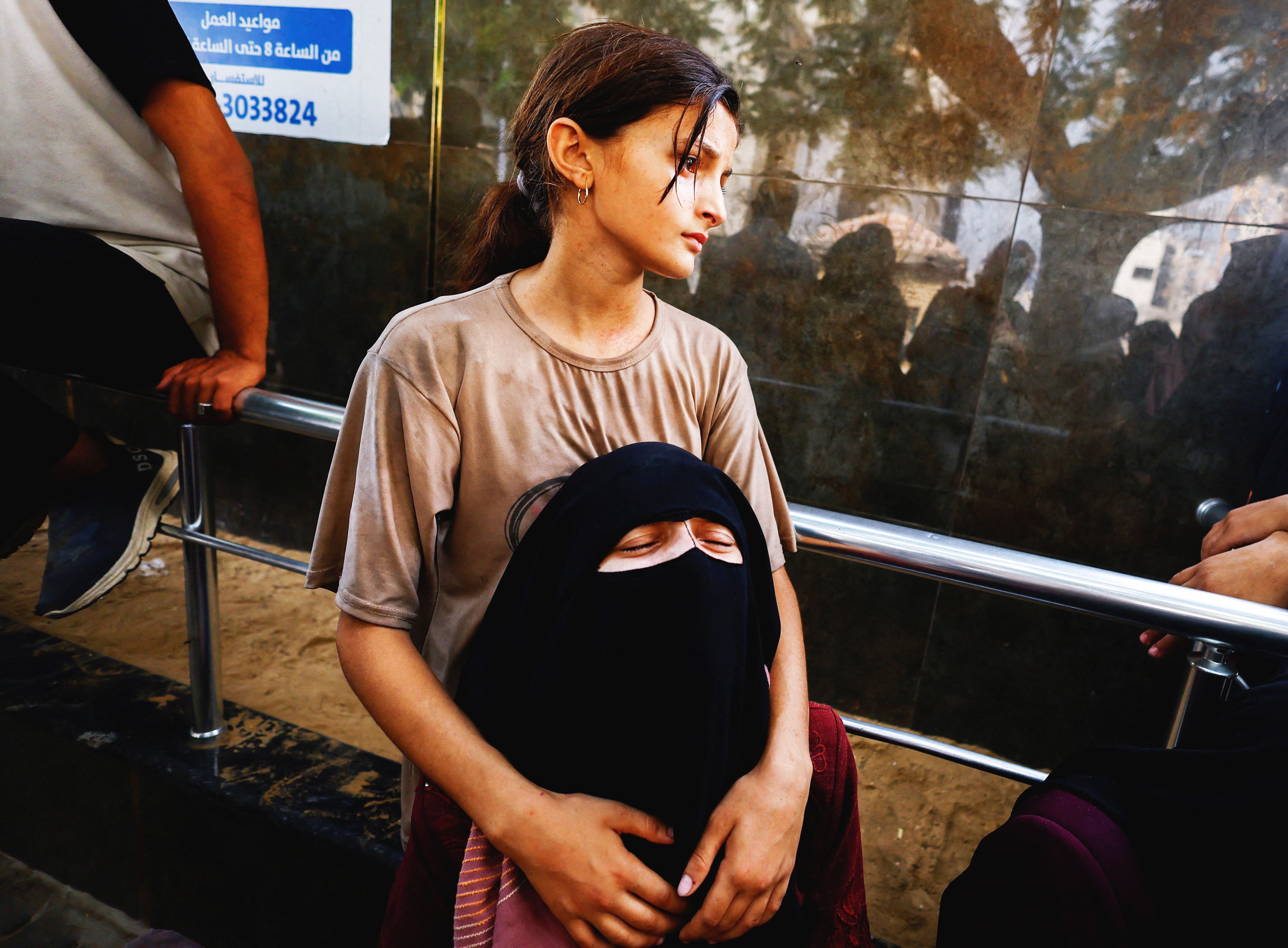 The sister of Palestinian man Mohammed Qandeel, who was killed in Israeli fire while seeking aid on Saturday, according to medics, grieves as she is comforted by her daughter during his funeral in Gaza City, on August 10, 2025. (Photo by Mahmoud Issa/Reuters)