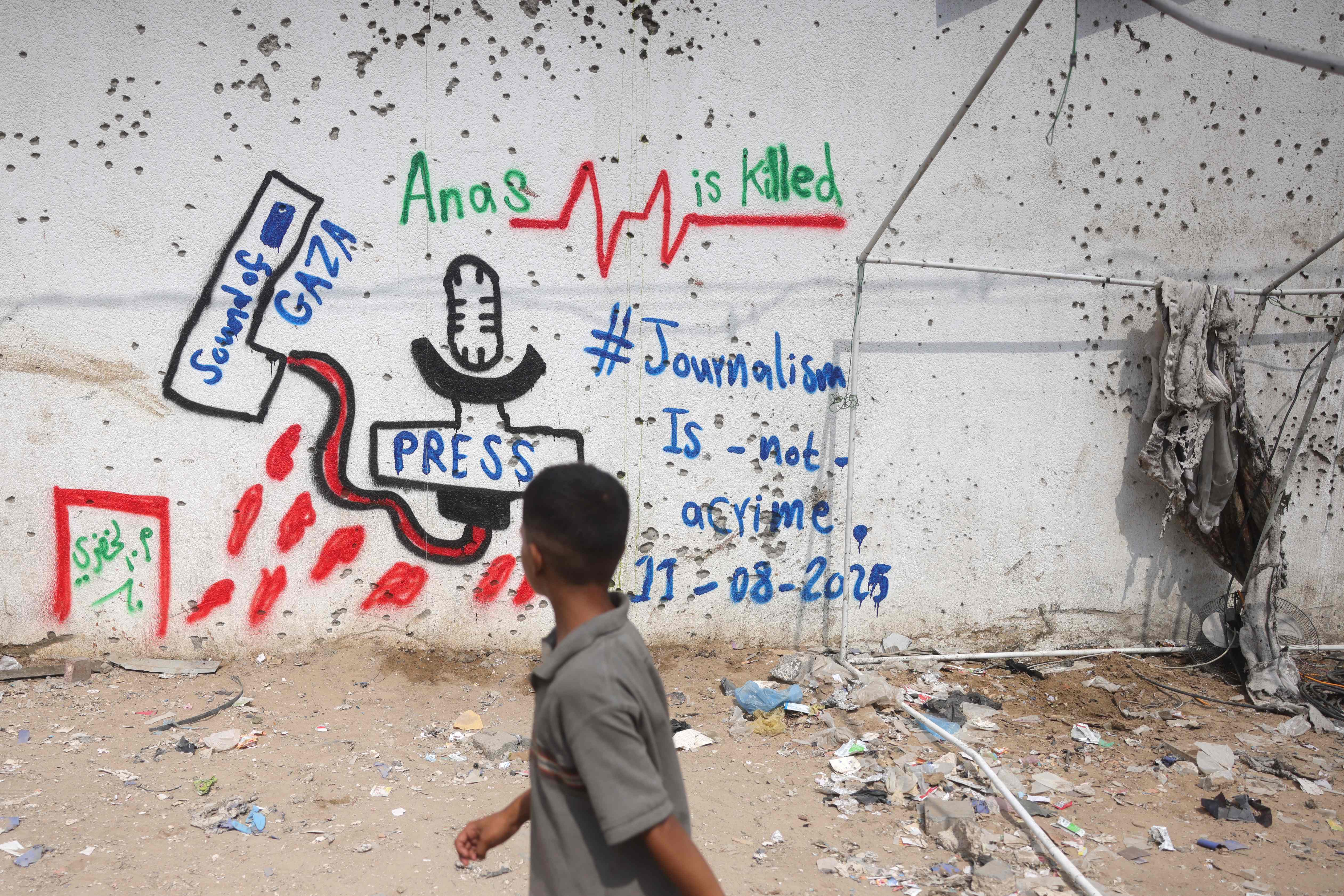 A Palestinian boy looks at a graffiti on the wall at the site where a deadly Israeli strike destroyed an Al Jazeera tent and killed six journalists, at the Al-Shifa Hospital in Gaza City on August 12, 2025. Condemnations poured in from the United Nations, the EU and media rights groups on August 11, after an Israeli strike killed an Al Jazeera news team in Gaza, as Palestinians mourned the journalists and Israel accused one of them of being a Hamas militant. (Photo by Bashar Taleb/AFP Photo)