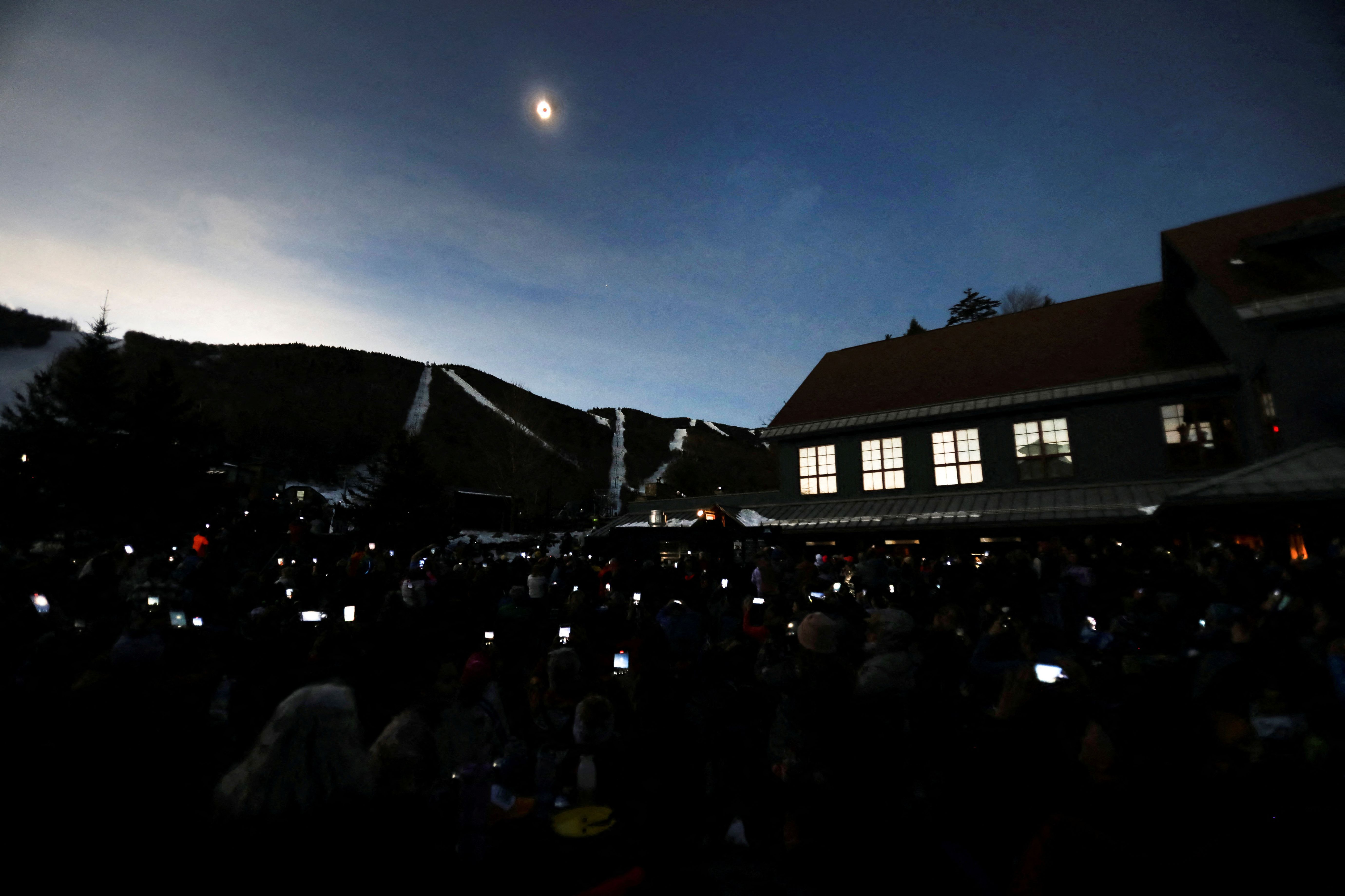 The sky darkens as people take photos with their phones of the total solar eclipse at Sugarbush ski resort in Warren, Vermont, U.S. April 8, 2024. (Photo by Lauren Owens Lambert/Reuters)