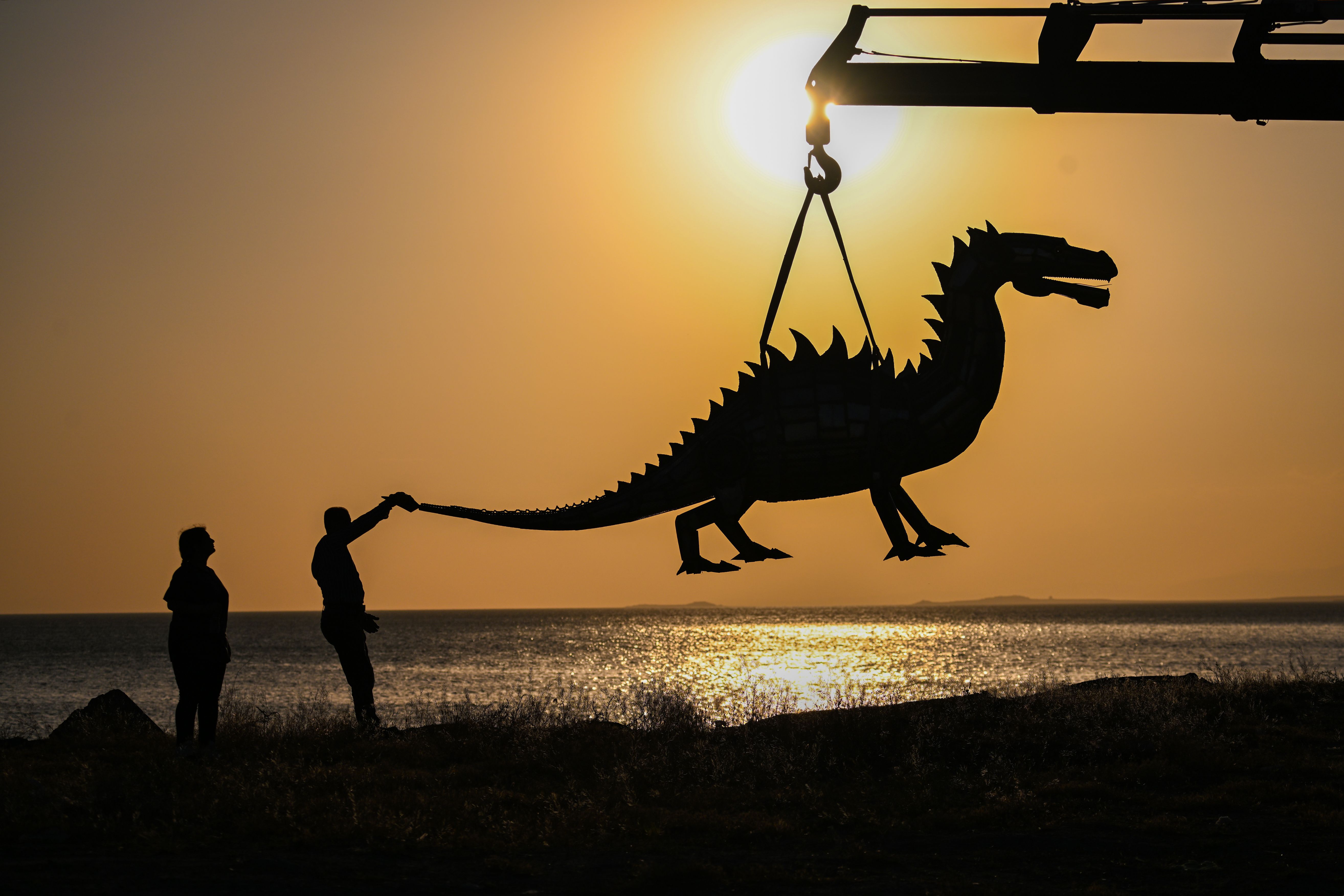 Iranian sculptor Ali Mutii, living in Van, transformed iron collected from scrap dealers into a sculpture of the “Van Lake Monster” in Van, Turkiye, on July 08, 2025. The sculpture, completed after long efforts and weighing 600 kilograms, was brought to the shore of Van Lake by crane, as it surprises those who saw it. (Photo by Ozkan Bilgin/Anadolu via Getty Images)