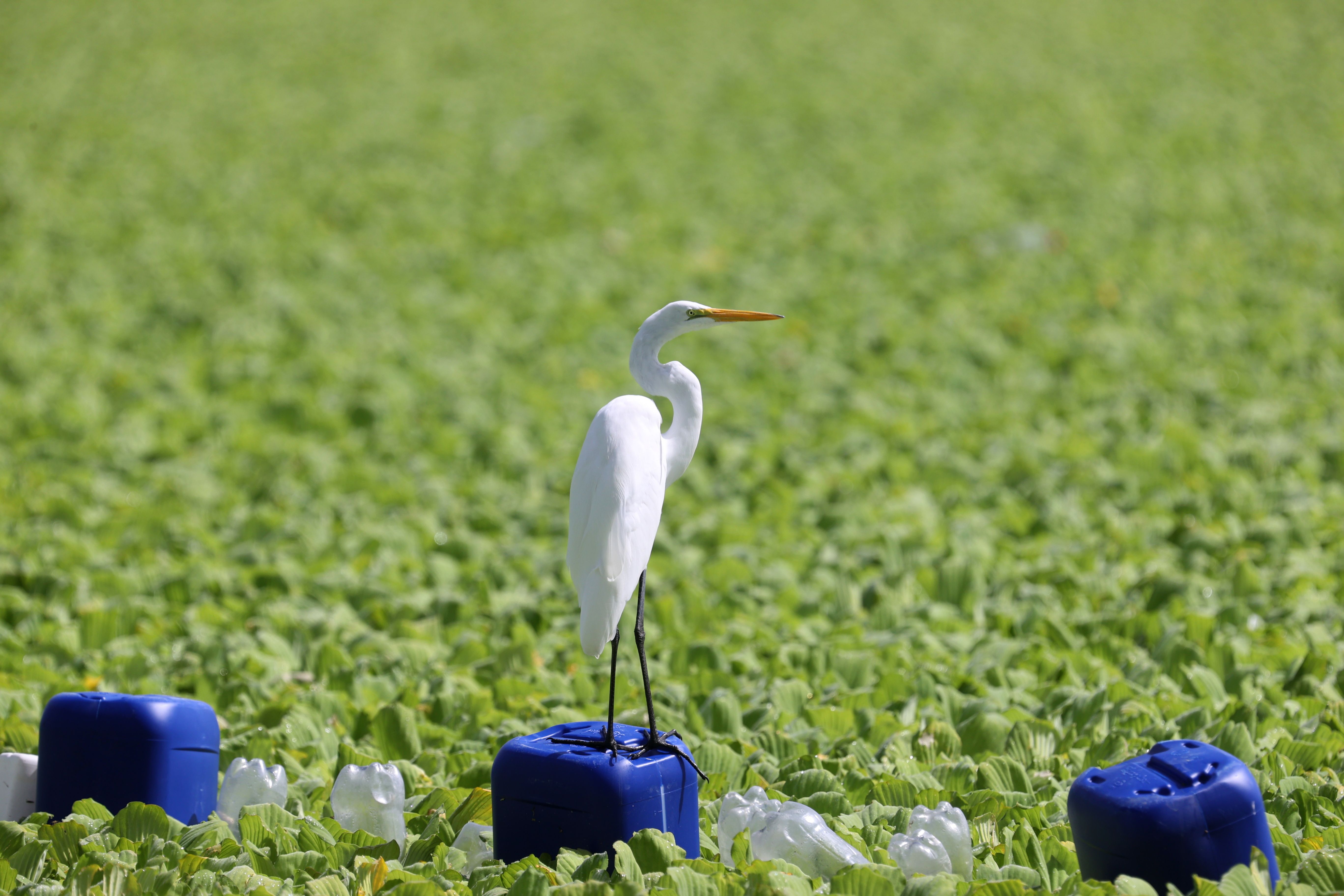 A heron perches on a plastic container on Lake Suchitlan affected by the aquatic plant Pistia Stratiotes in Cuscatlan, El Salvador, 14 August 2025. Fishing and tourism are affected by the proliferation of the plant, which has covered practically the entire surface of the lake, causing economic losses for the inhabitants of the area. (Photo by Vladimir Chicas/EPA)