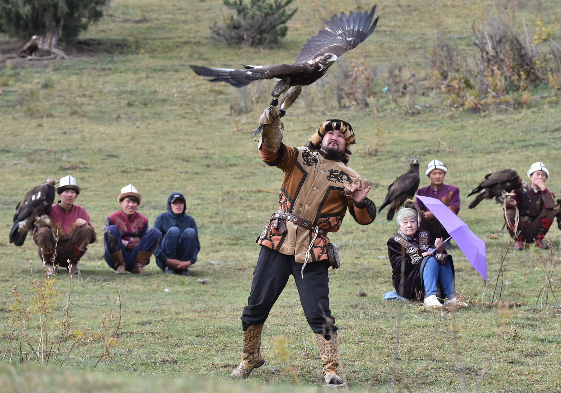A Kyrgyz “berkutchi” (an eagle hunter) holds his golden eagle, during the hunting festival “Salburun”, in the Chunkurchak gorge, some 30 kilometres outside Bishkek, on August 29, 2022. Archers from Kazakhstan, Uzbekistan, Turkey, Malaysia, Singapore, Mongolia, Russia, Hungary, USA, Czech Republic, Germany, France, India, Spain and Indonesia take part in the festival of traditional hunting from Central Asia. (Photo by Vyacheslav Oseledko/AFP)