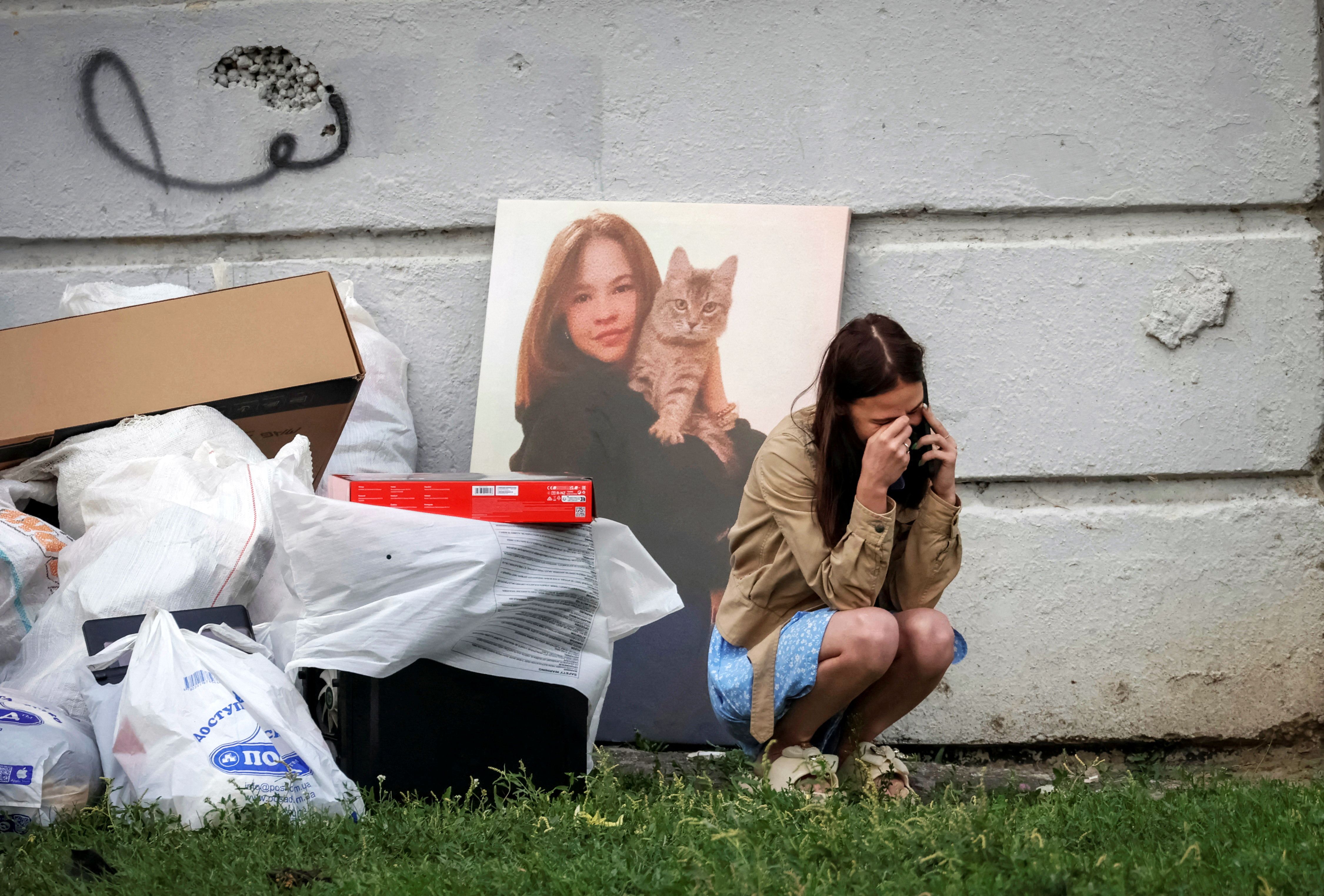 A resident reacts as she sits near plastic bags with her belongings at the site of an apartment building hit by a Russian drone strike, in Kharkiv, Ukraine on August 18, 2025. (Photo by Sofiia Gatilova/Reuters)