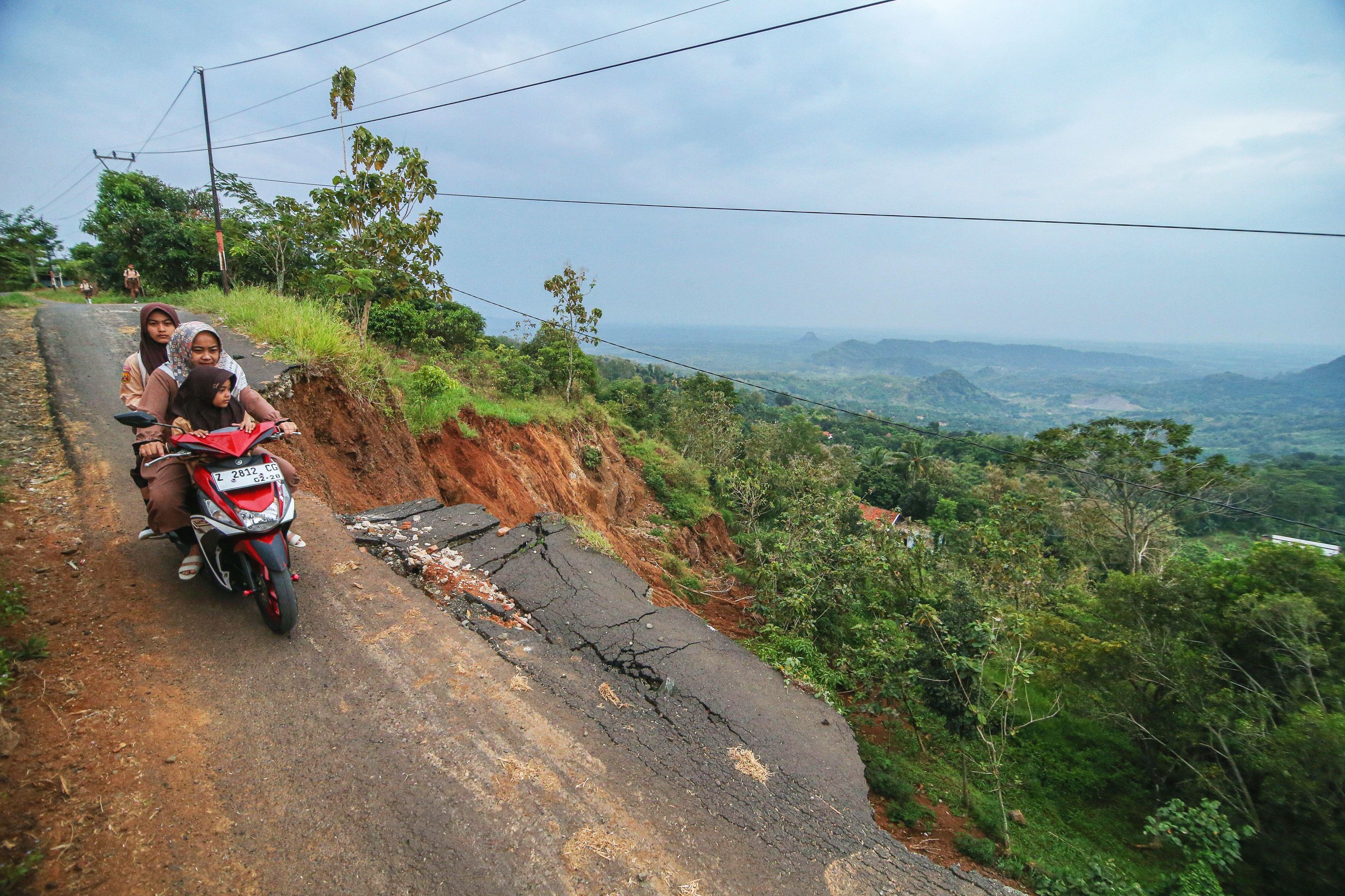 A mother takes her child to school on a motorcycle through a road damaged by a landslide in Jatigede Subdistrict, Sumedang Regency, West Java, Indonesia on July 14, 2025. Based on data from Cipicung Village Office, the landslide that occurred on May 14, 2025 occurred due to high rainfall and caused 5 houses and 6 families to be evacuated. (Photo by Claudio Pramana/ZUMA Press Wire via Alamy Live News)