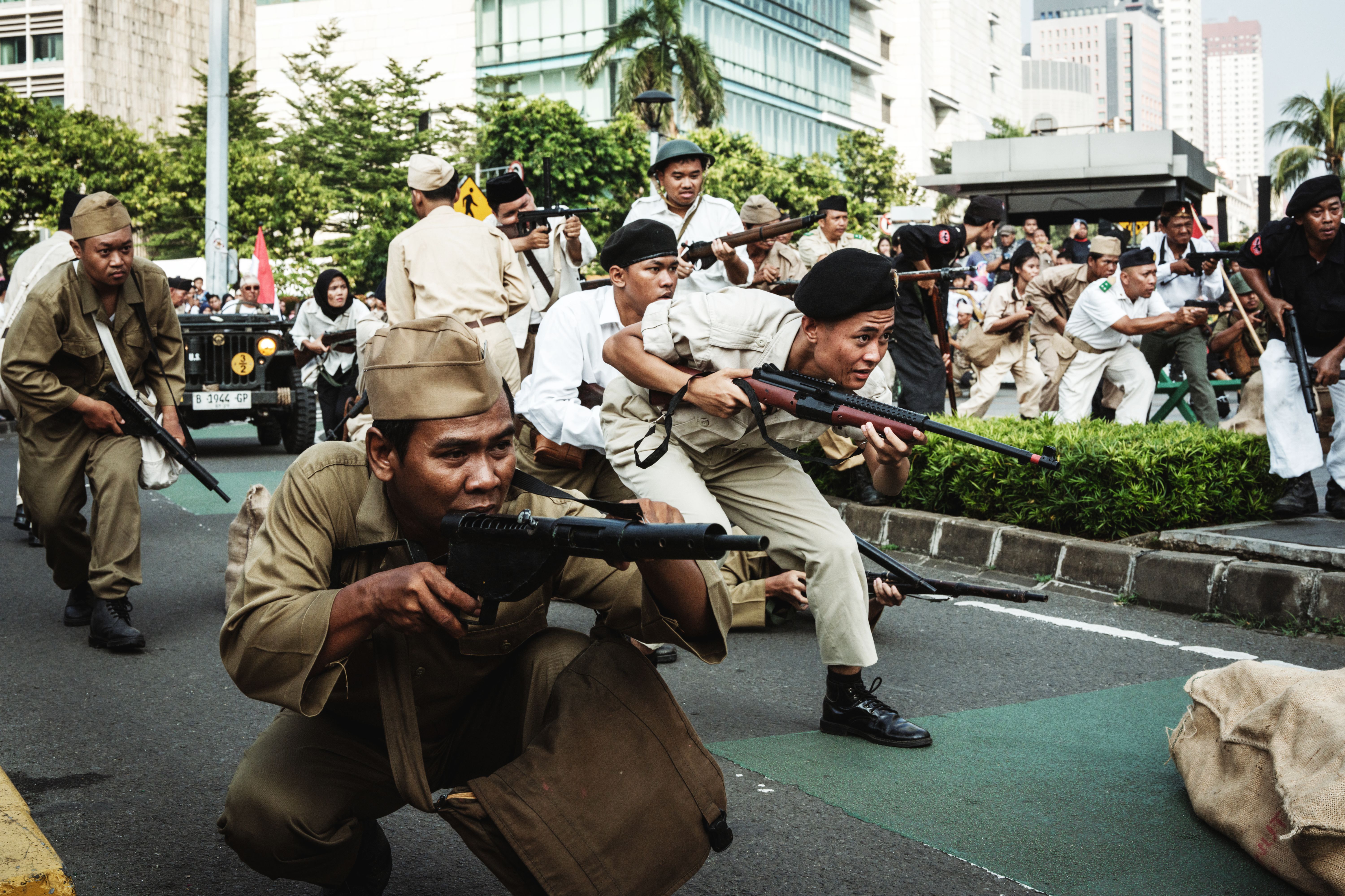 Actors perform a reenactment of the 1949 General Offensive on Surakarta, one of the last major battles after Indonesia's 1945 independence proclamation against Dutch forces that refused to recognize it, during National Veterans Day commemorations on a street in Jakarta on August 10, 2025. (Photo by Yasuyoshi Chiba/AFP Photo)