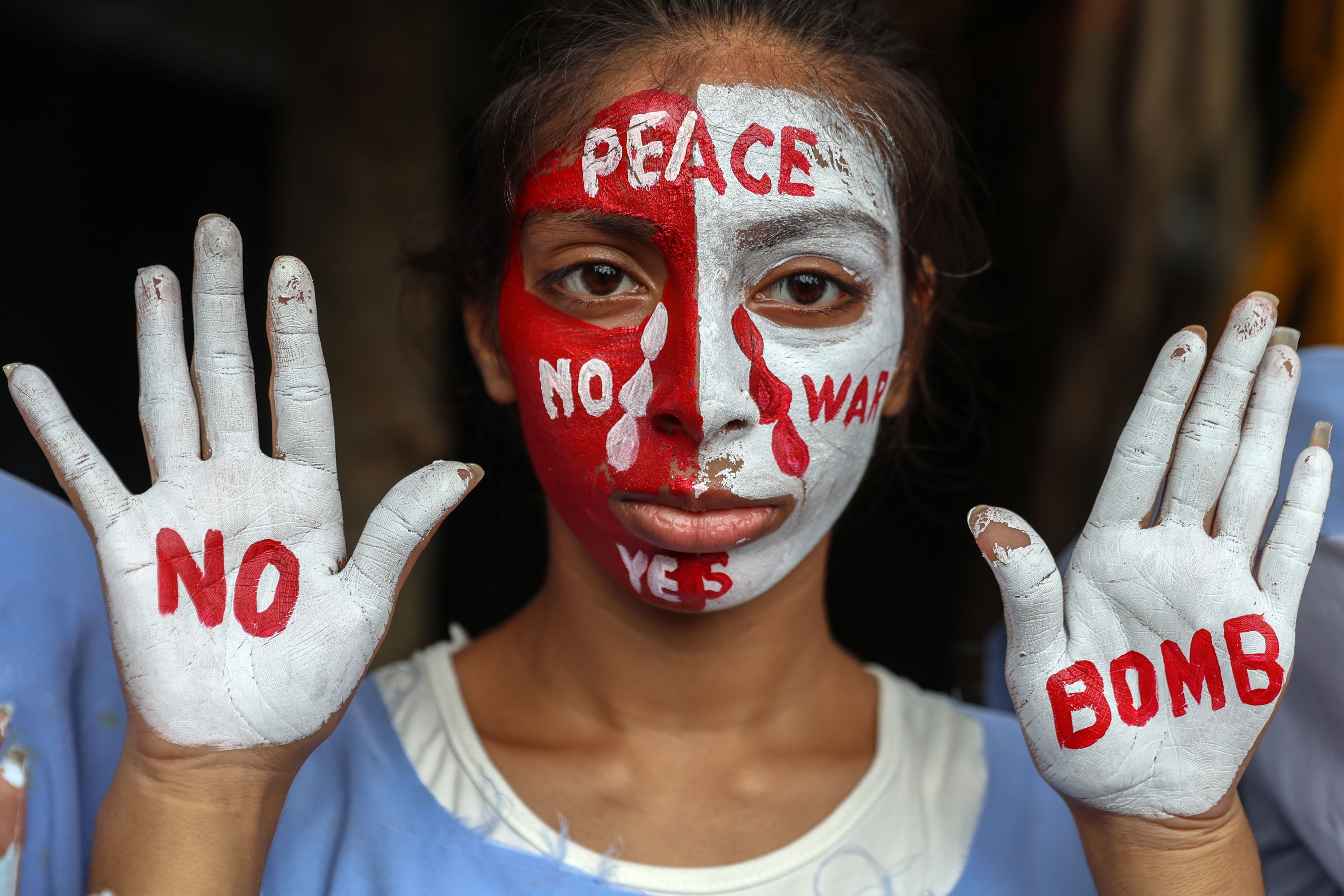 An Indian student with peace messages written on her face and hands takes part in a “Hiroshima Day” peace rally in Mumbai, India, 06 August 2025. Students and social activists gathered in Mumbai to mark the 80th anniversary of the nuclear bombing in Hiroshima. (Photo by Divyakant Solanki/EPA)