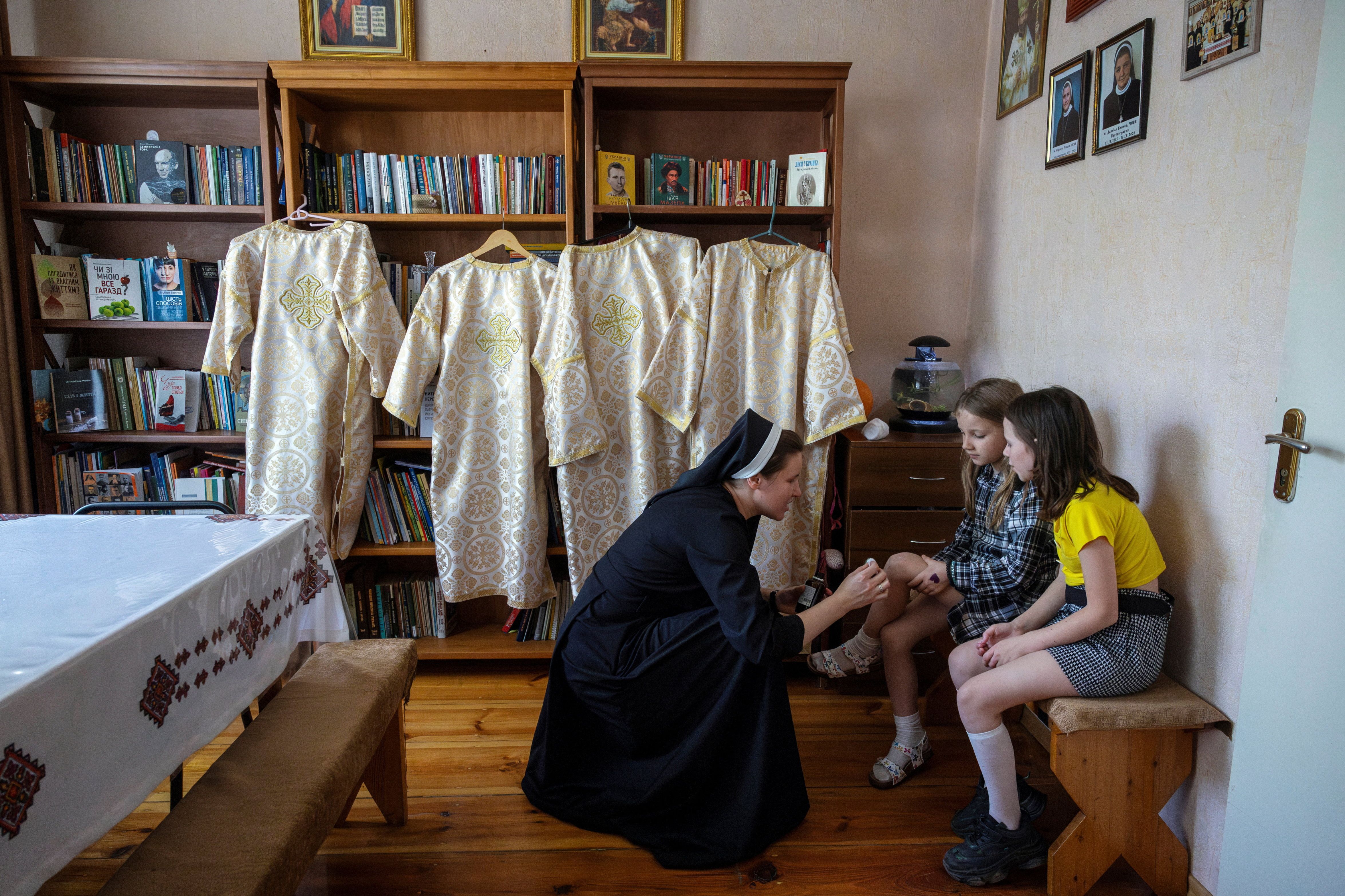 Sister Bernadeta Dvernytska of the Order of Saint Basil the Great attends to the bruised knee of a girl who is part of the church community, at the order's monastery in Zaporizhzhia, Ukraine, on June 1, 2025. This community of Ukrainian Catholics tends to people exiled from occupied territory, Church members deliver humanitarian aid to Ukrainian troops and villages near the frontline and nuns offer comfort to families and especially children fleeing the war. (Photo by Thomas Peter/Reuters)