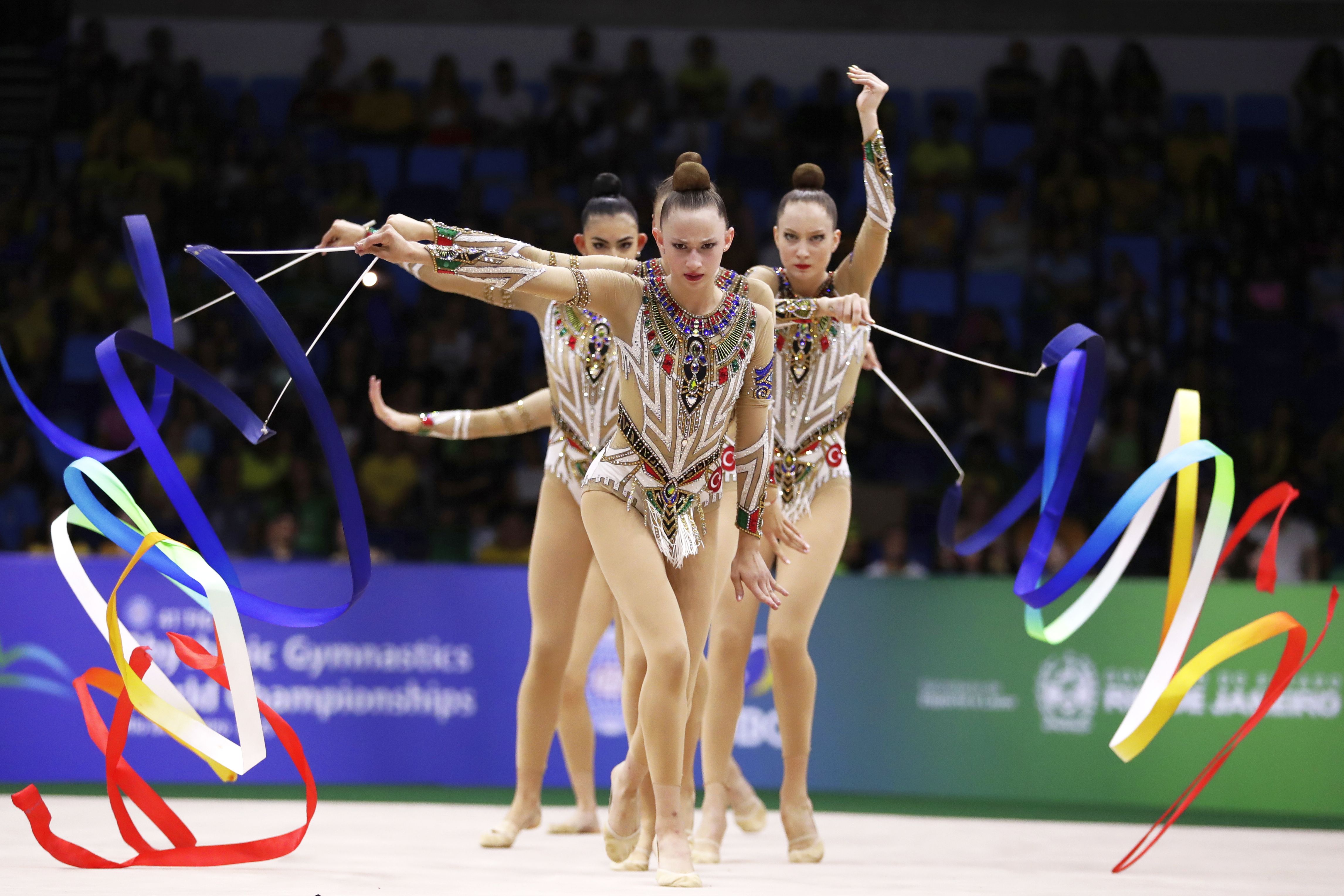 Turkey's team competes with ribbons during the group all-around final at the 41st FIG Rhythmic Gymnastics World Championships at Carioca Arena, in Rio de Janeiro, Saturday, August 23, 2025. (Photo by Bruna Prado/AP Photo)