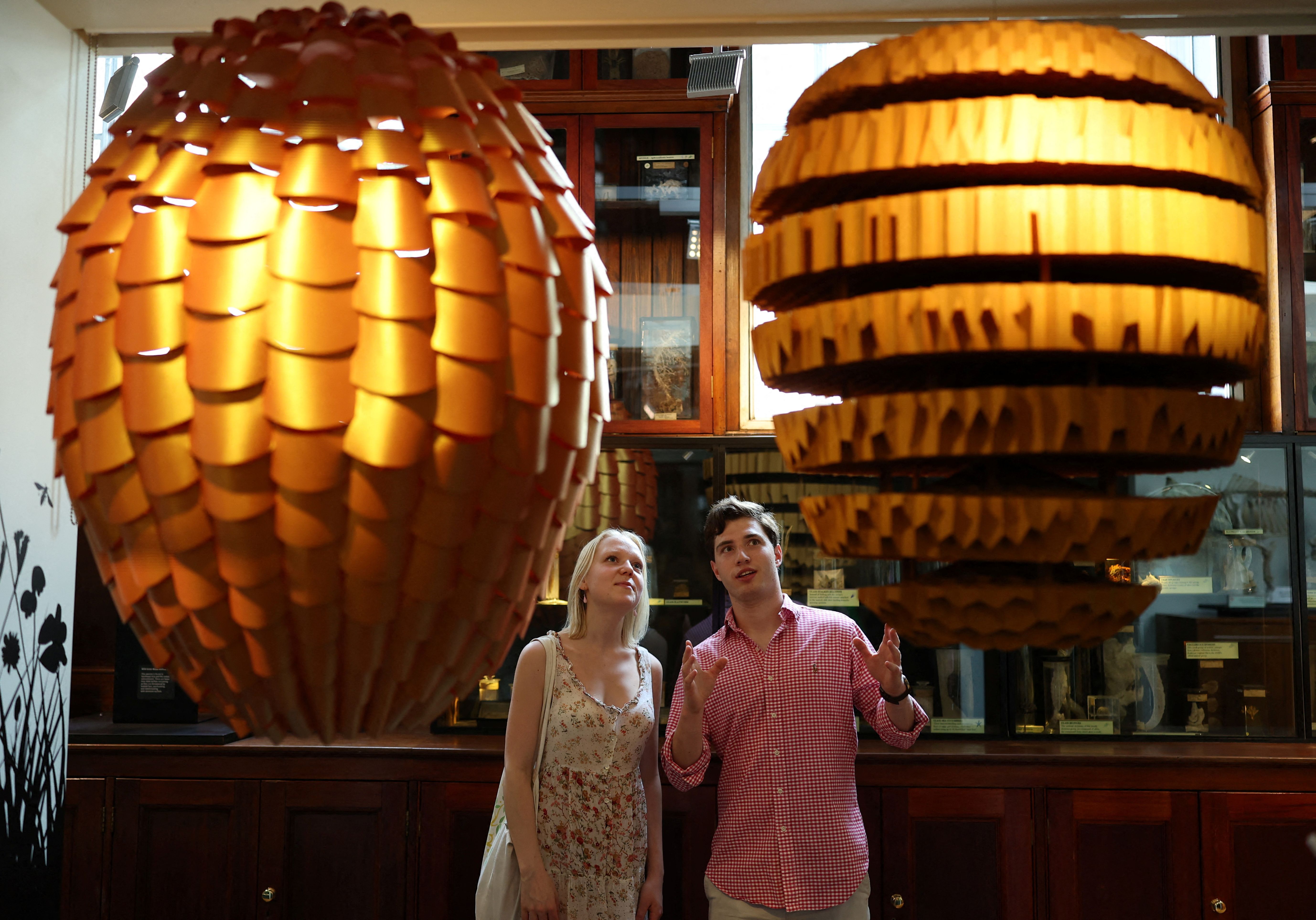 Visitors look at “Shell & Comb” by artist Peter Ayres, a sculpture made from paper that reflects how wasps construct their nests using saliva-bound wood pulp, on display as part of “World of Wasps”, the world's first exhibition centred on wasps at The Grant Museum of Zoology, in London, Britain, on June 25, 2025. (Photo by Isabel Infantes/Reuters)