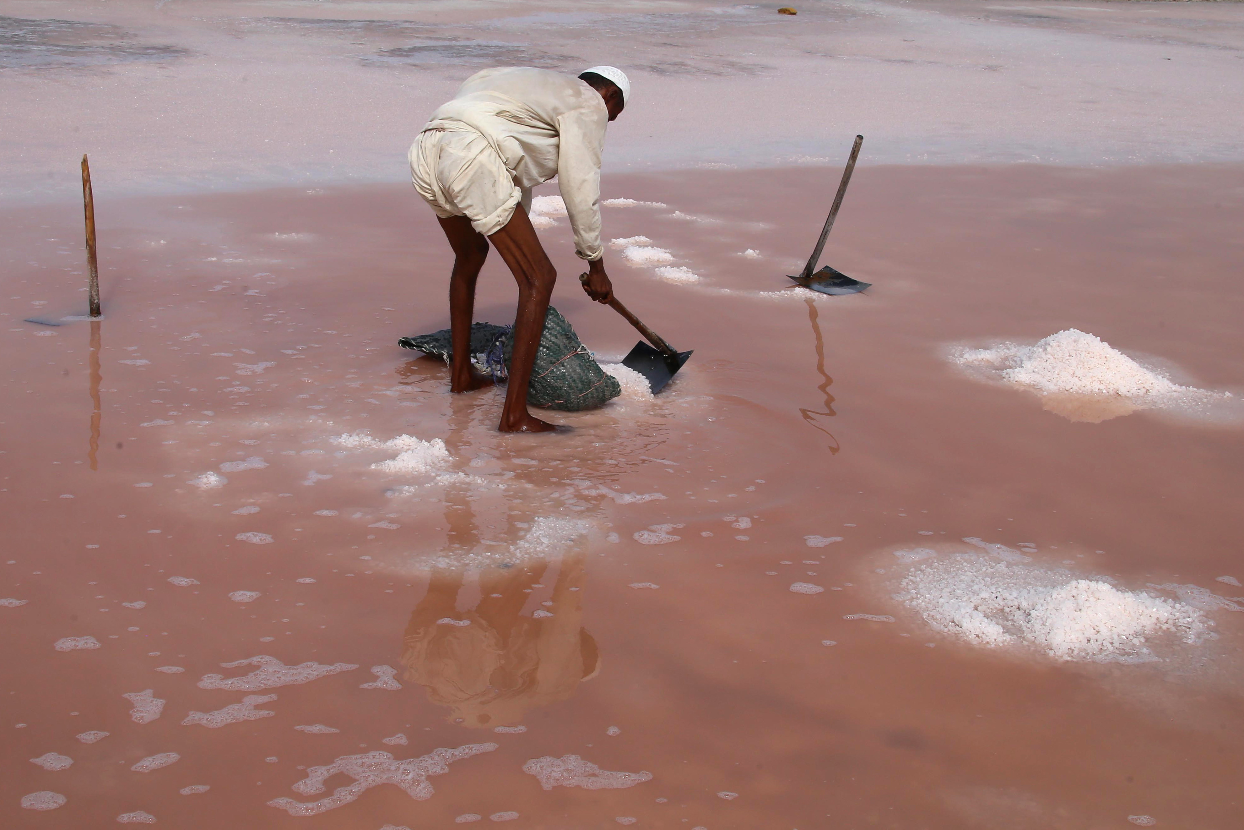 A man extracts sea salt from a salt field in Sandspit, on the outskirts of Karachi, Pakistan, 12 July 2025. A traditional occupation in Karachi's coastal areas, the manual extraction of salt from seawater through solar evaporation in shallow ponds or salt pans provides livelihoods for numerous residents. (Photo by Rehan Khan/EPA)