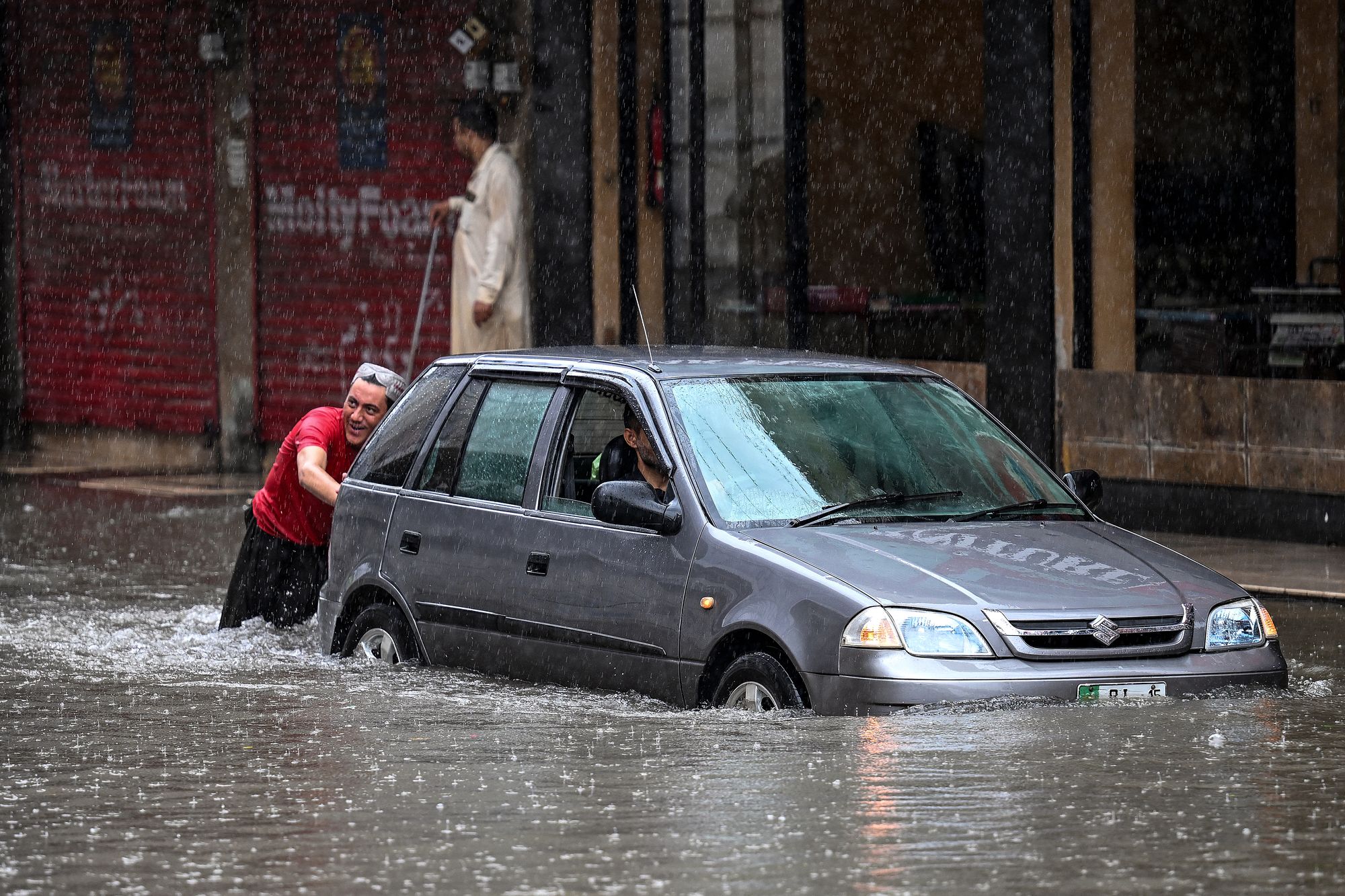 A man pushes a car through a flooded street during heavy monsoon rains in Rawalpindi on July 17, 2025. Monsoon rains in Pakistan have been linked to more than 110 deaths including dozens of children since they arrived in late June, according to government figures released on July 14. (Photo by Aamir Qureshi/AFP Photo)