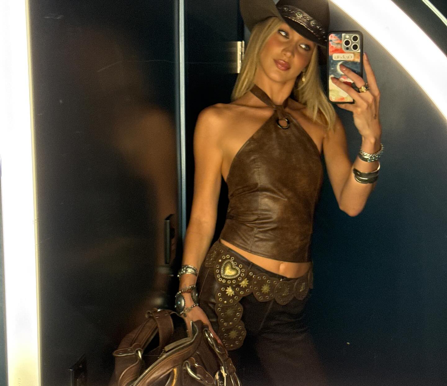 American model Bella Hadid on August 17, 2025 channels her inner cowgirl in a stylish mirror snap. (Photo by bellahadid/Instagram)