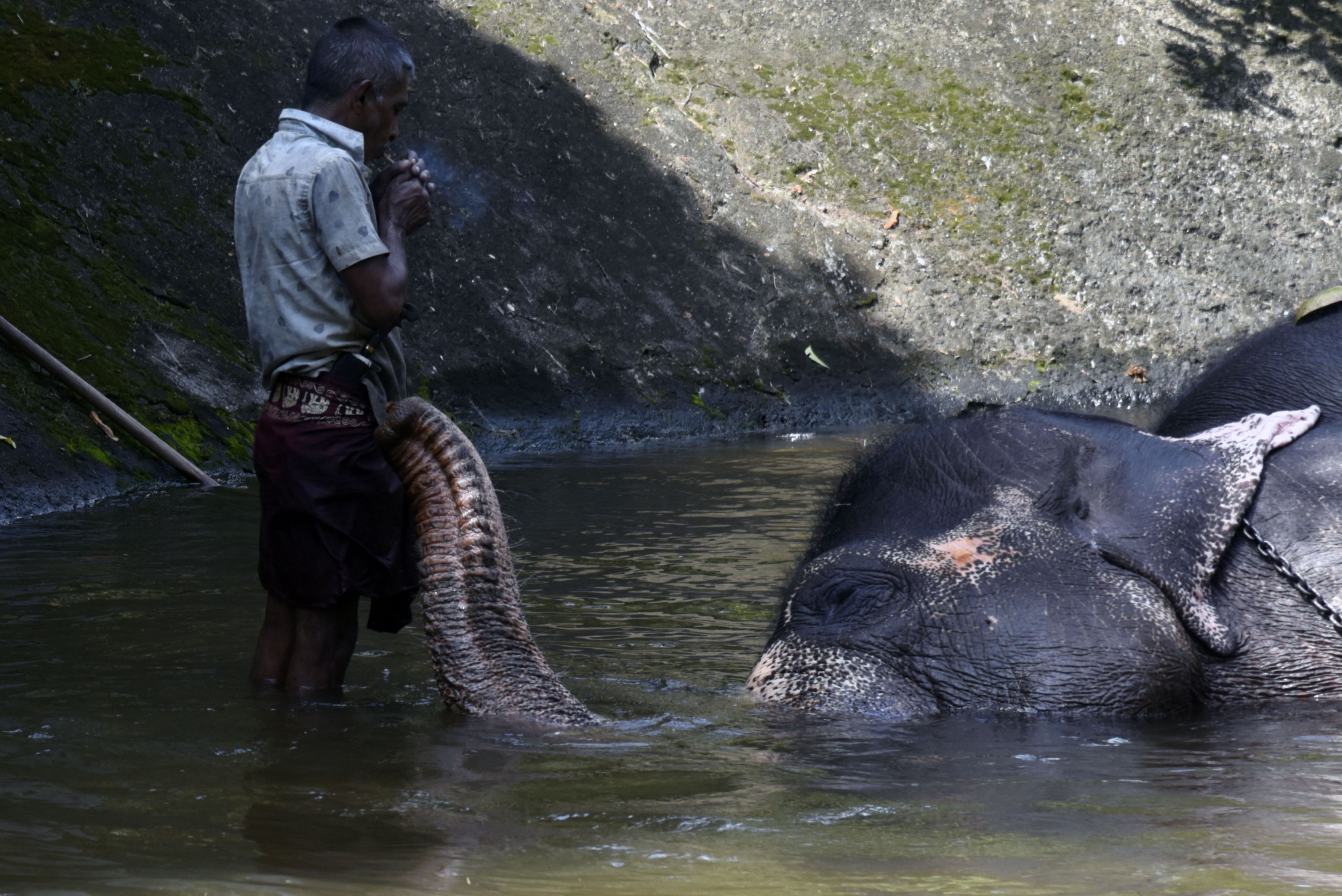 A mahout lights a cigarette (Beedi) after finishing washing an elephant near Colombo, Sri Lanka, on February 11, 2025. (Photo by Akila Jayawardena/NurPhoto/Rex Features/Shutterstock)