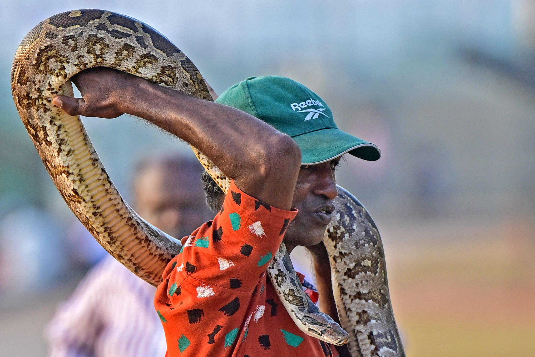 A snake charmer holds a python at the Galle Face promenade in Colombo on February 21, 2025. (Photo by Ishara S. Kodikara/AFP Photo)