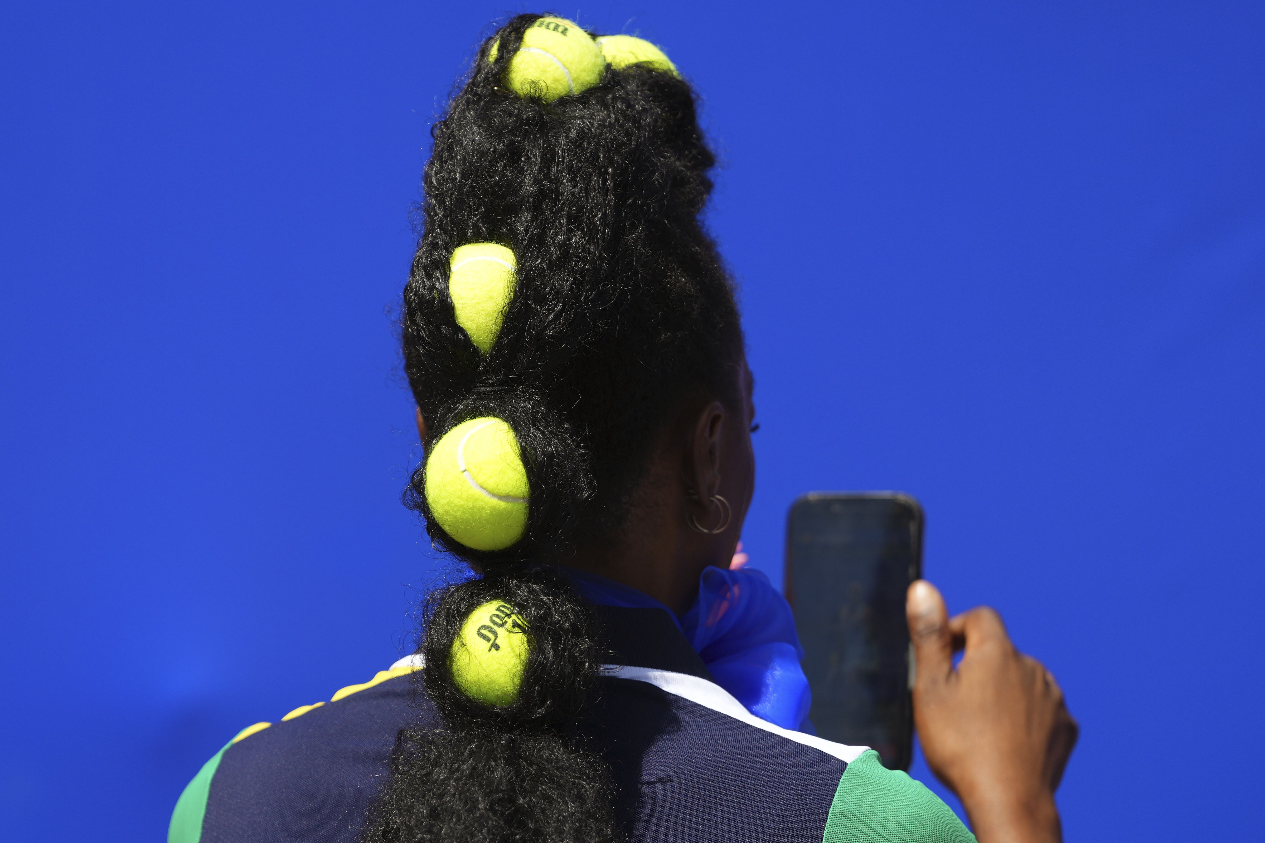 Shaniqua Martin takes a selfie in front of a photo of Coco Gauff during the first round of the US Open tennis championships, Monday, August 25, 2025, in New York. (Phot by Kirsty Wigglesworth/AP Photo)