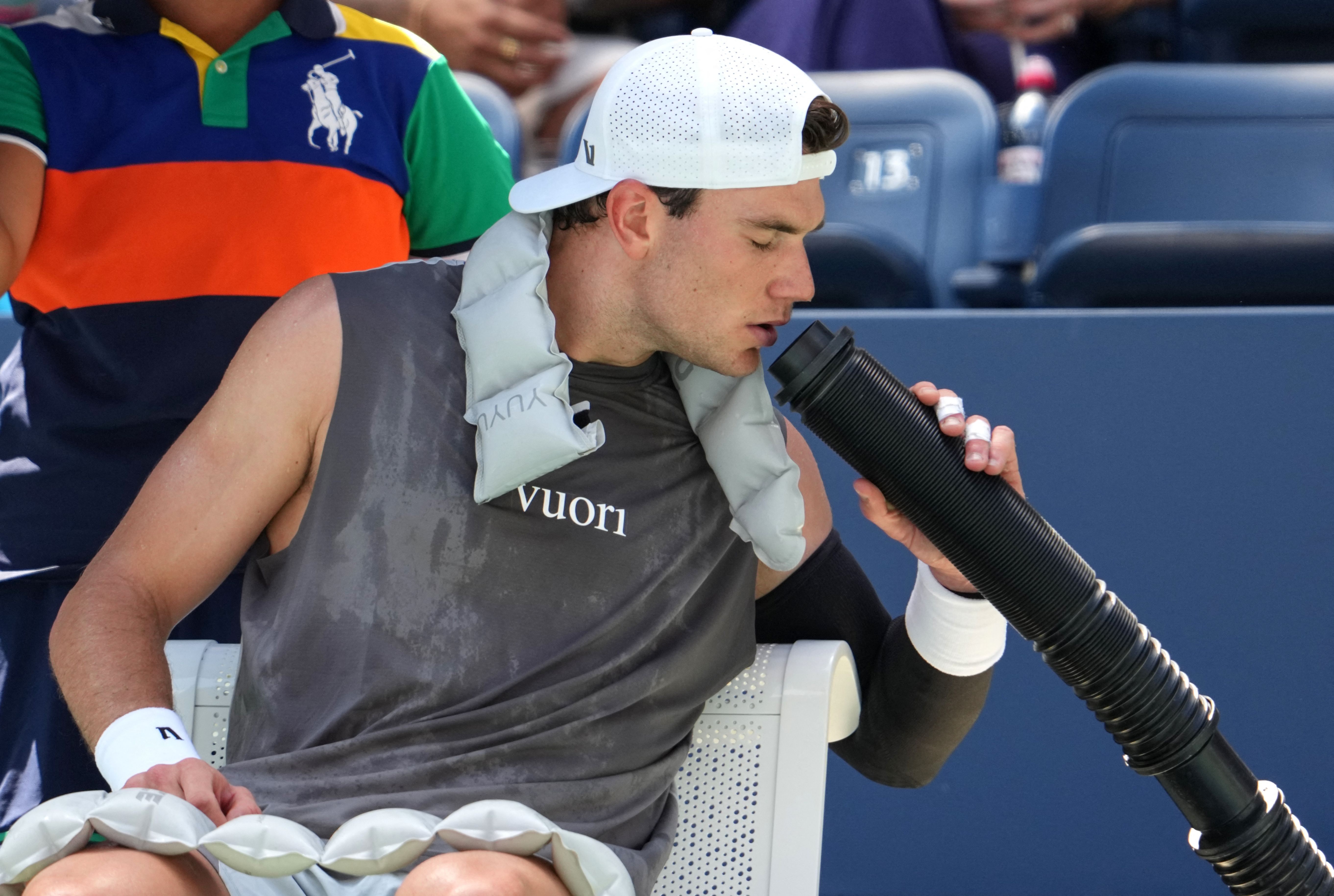 Britain's Jack Draper cools off during his men's singles first round tennis match against Argentina's Federico Agustin Gomez on day two of the US Open tennis tournament at the USTA Billie Jean King National Tennis Center in New York City, on August 25, 2025. (Photo by Timothy A. Clary/AFP Photo)