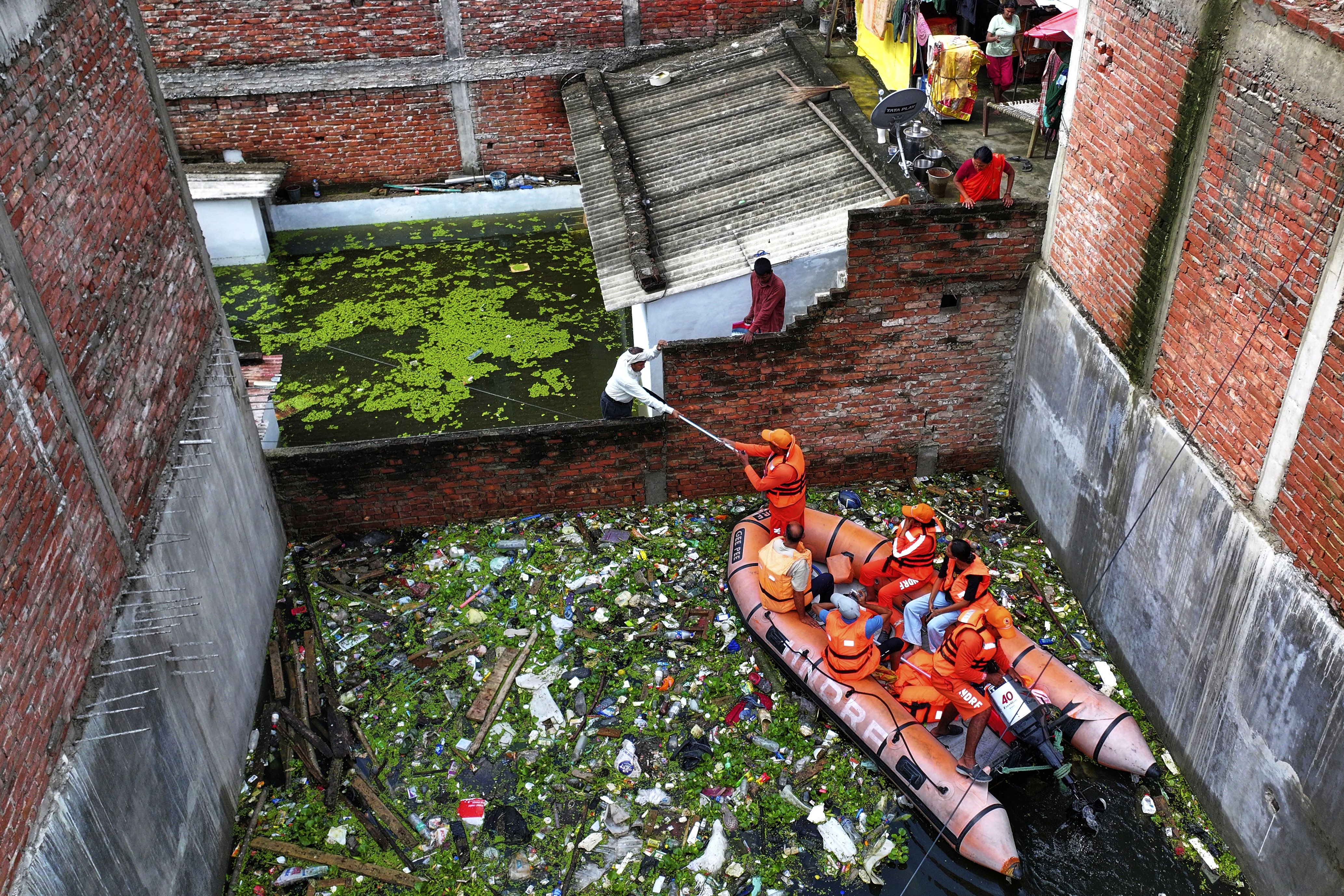 Members of India's National Disaster Response Force distribute food supplies to stranded residents in a submerged area following heavy monsoon rains along the banks of the River Ganga, in Prayagraj, India, August 5, 2025. (Photo by Rajesh Kumar Singh/AP Photo)