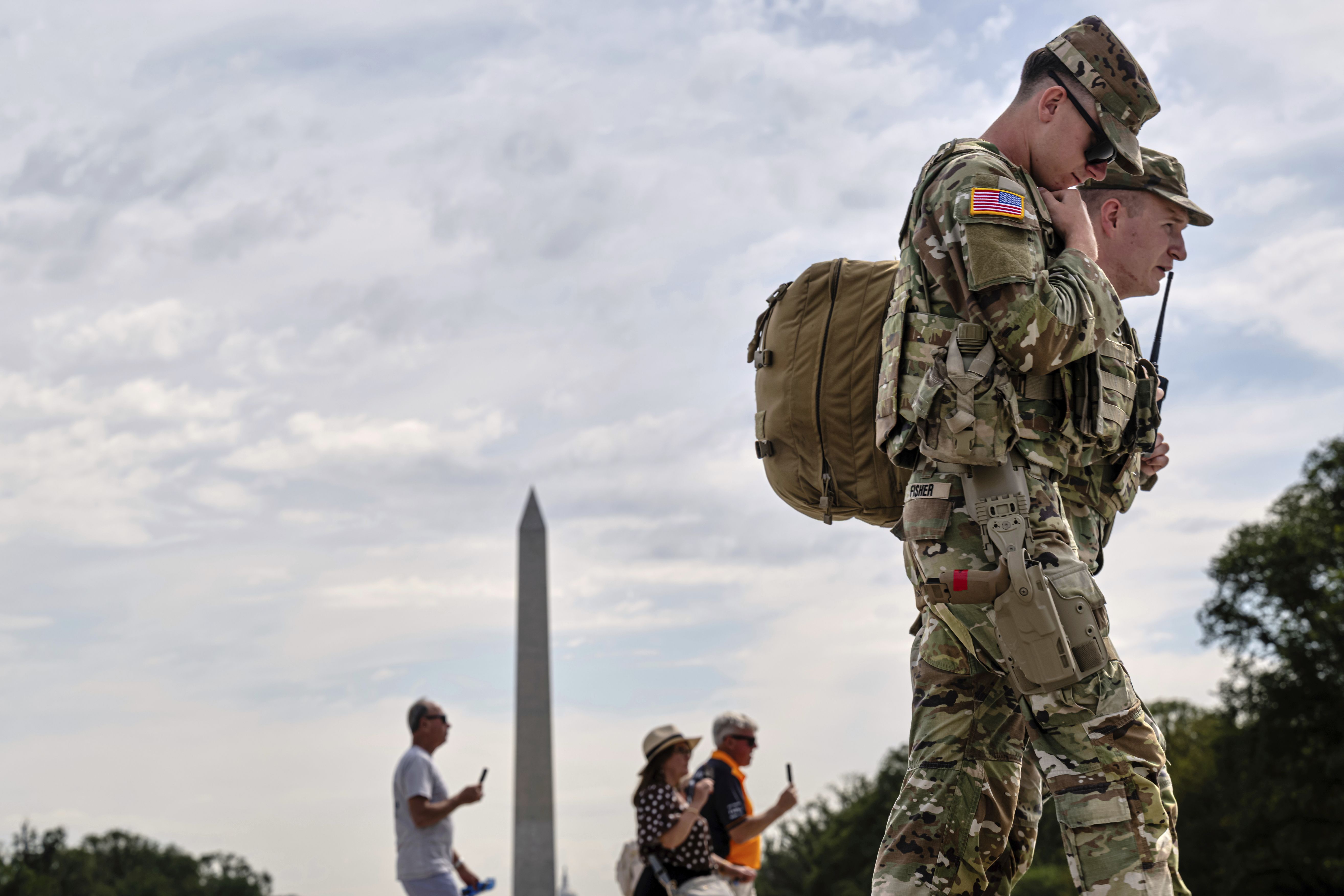 Visitors and members of the U.S. National Guard walk near the Lincoln Memorial, Thursday, August 28, 2025, in Washington. (Photo by Jon Cherry/AP Photo)
