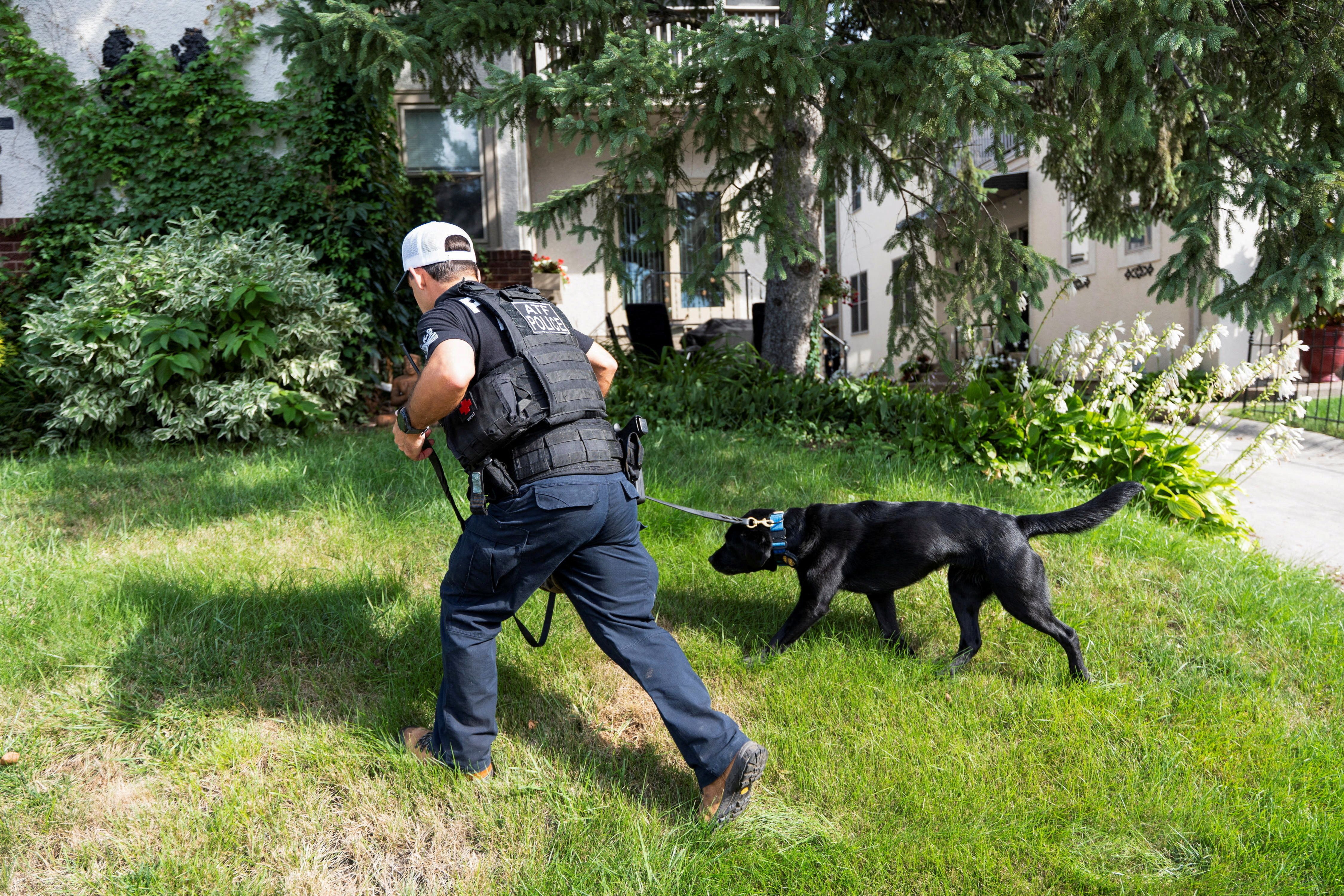 A K-9 dog searches a front yard, after a shooting at Annunciation Church, which is also home to an elementary school, in Minneapolis, Minnesota, on August 27, 2025. (Photo by Tim Evans/Reuters)