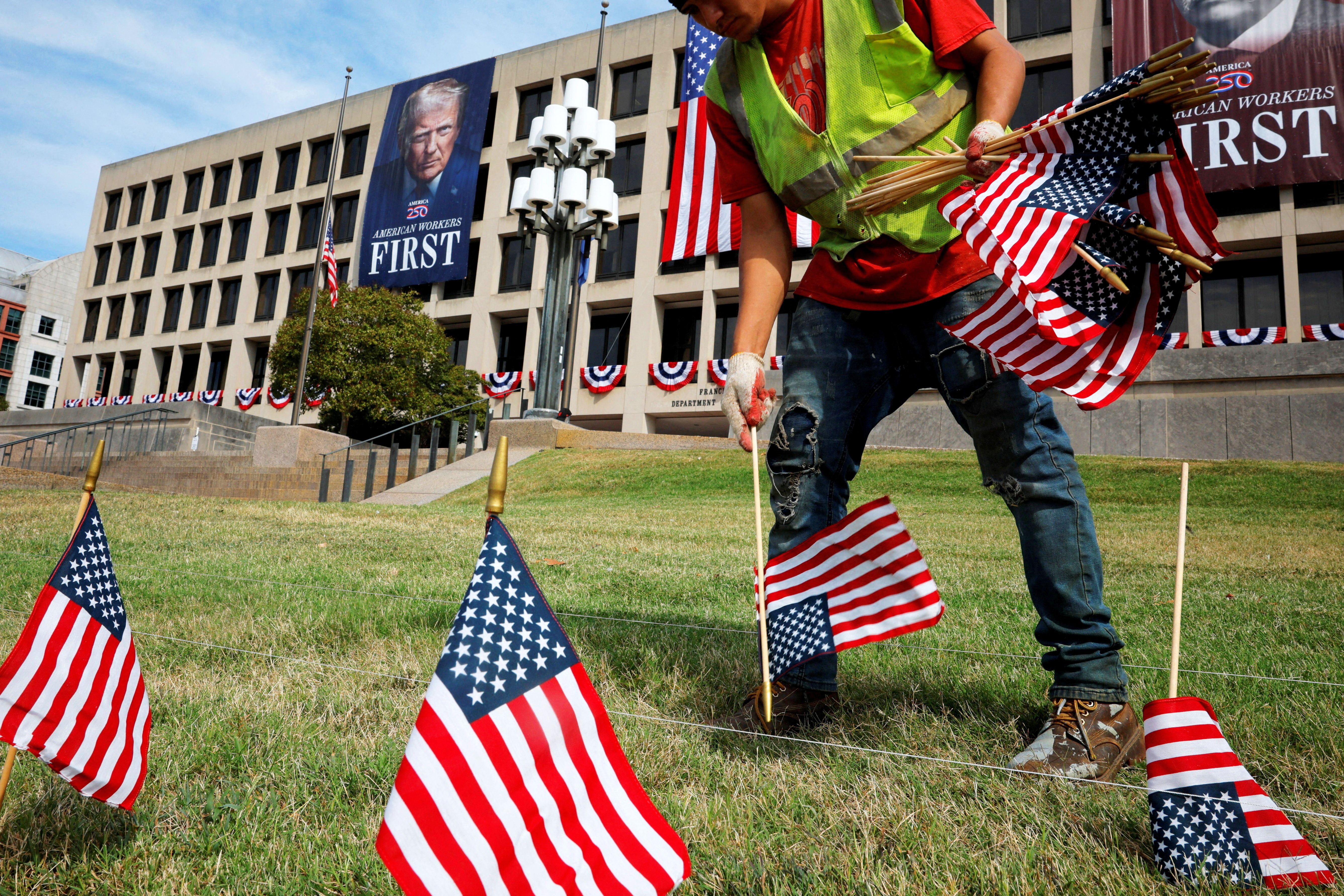 A worker plants U.S. flags in front of the Department of Labor building, displaying banners depicting President Trump, in Washington, on August 28, 2025. (Photo by Brian Snyder/Reuters)