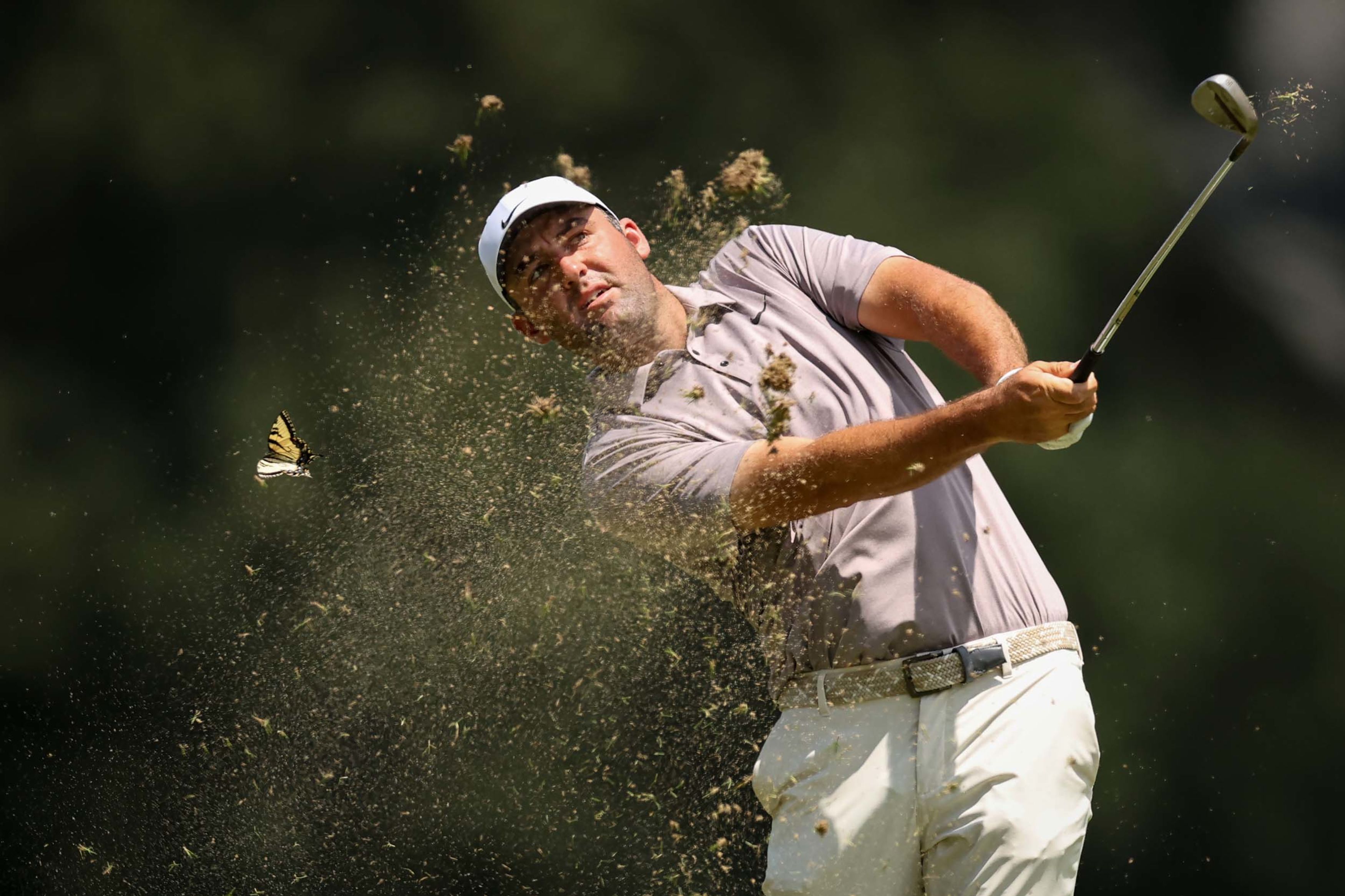 A butterfly flies past Scottie Scheffler as he hits an approach during the final round of the FedEx St. Jud Championship in Memphis, Tennessee, on Sunday, August 10, 2025. (Photo by Stacy Revere/Getty Images)
