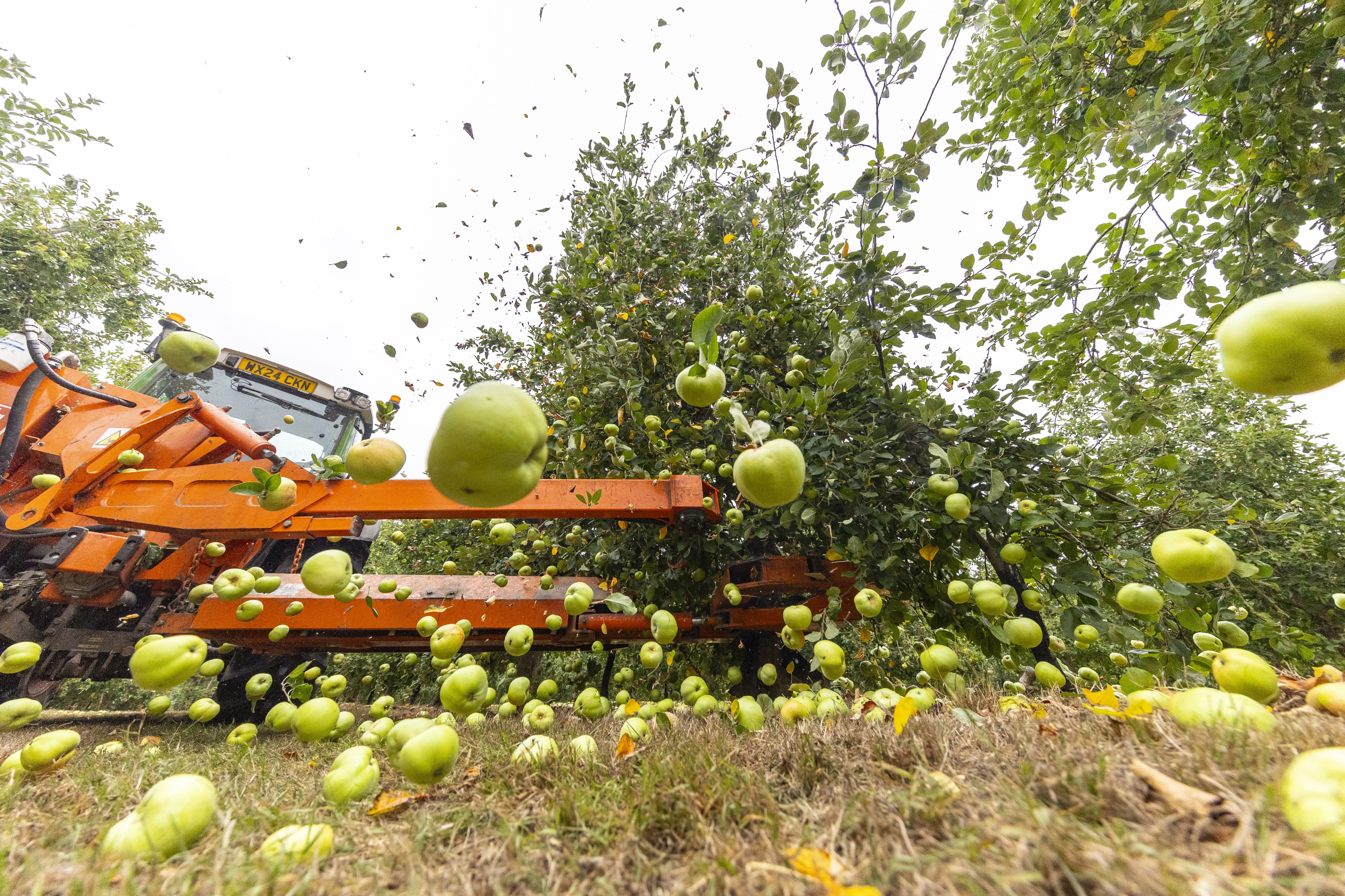 Apples are collected from an orchard in Somerset. UK for the cider company on August 20, 2025. Thatchers, marking its earliest harvest in more than 120 years thanks to a hot summer. (Photo by Brad Wakefield)