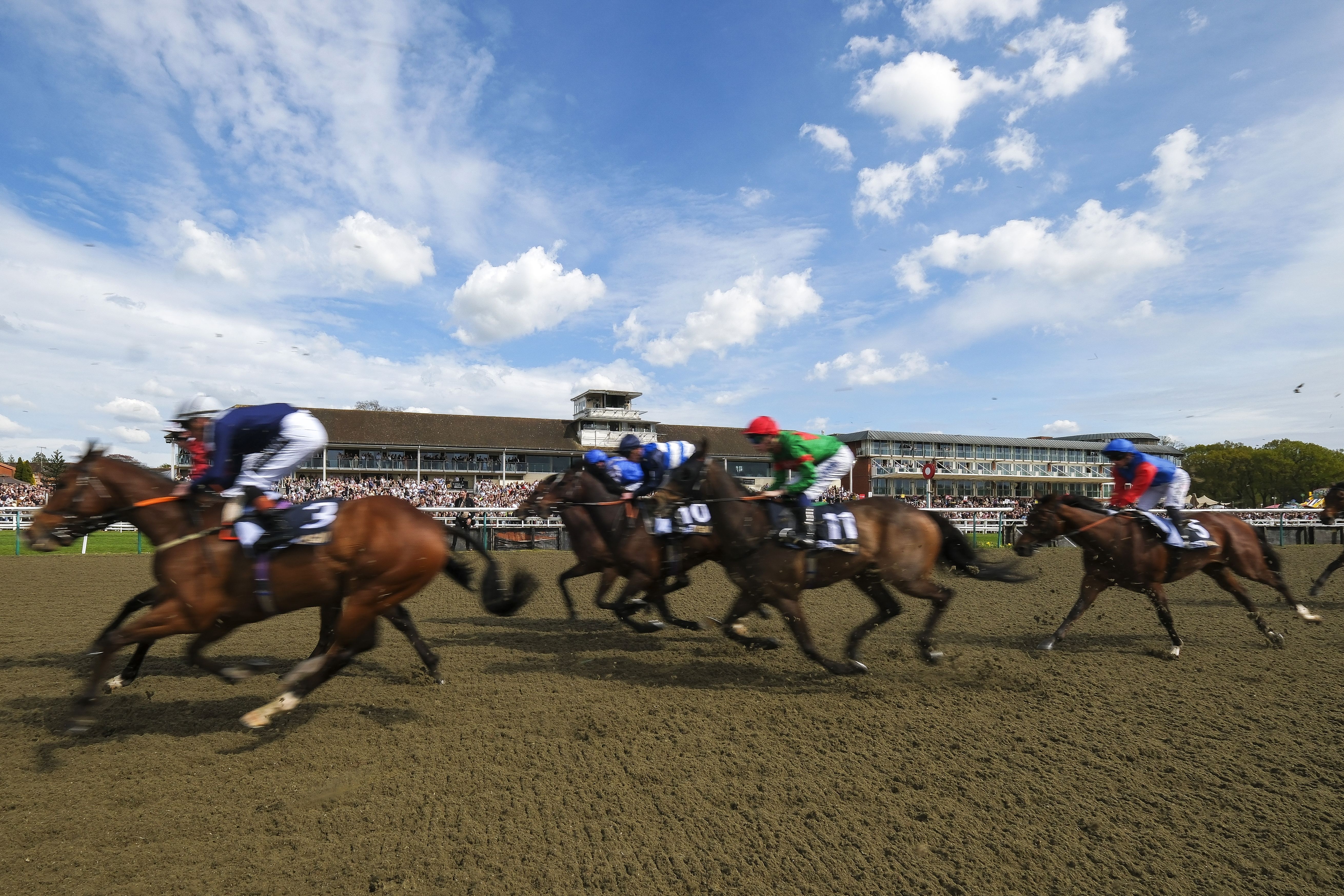 A general view as a packed grandstand watch the finish to The BetMGM All Weather Vase Mile Handicap at Lingfield Park on April 18, 2025 in Lingfield, England. (Photo by Alan Crowhurst/Getty Images)