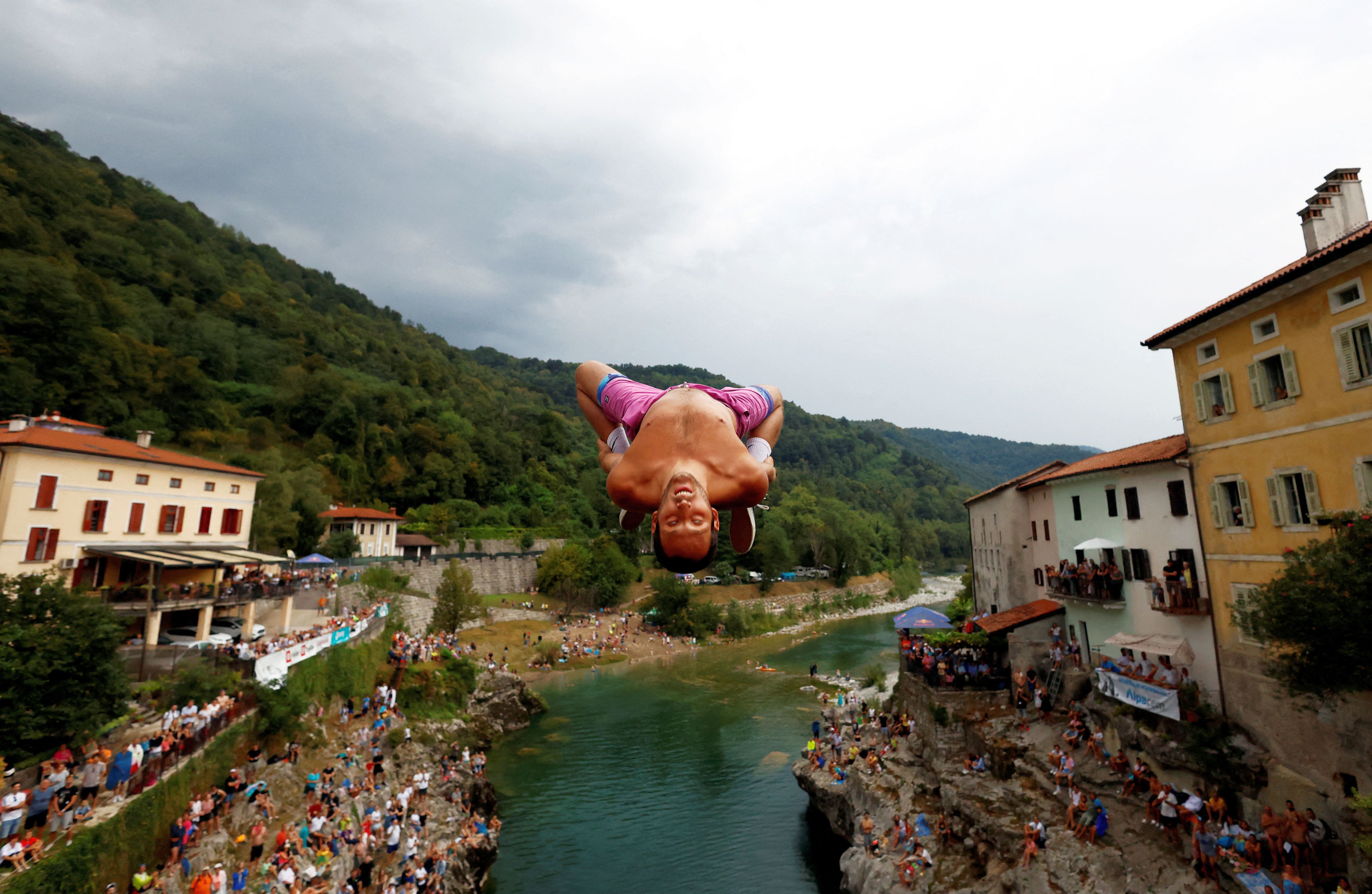 A man jumps from a 17-meter-high bridge during a diving competition, in Kanal, Slovenia, on August 17, 2025. (Photo by Borut Zivulovic/Reuters)