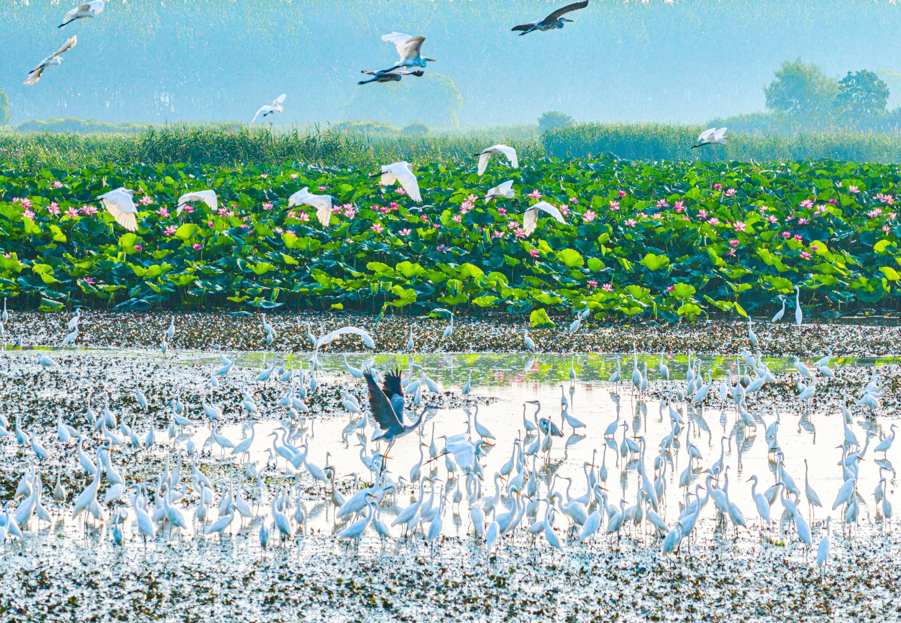 Egrets fly among the blooming lotus flowers in the Linhuai section of Hongze Lake Wetland in Sihong County, Suqian City, Jiangsu Province, China, on August 8, 2025. (Photo by Costfoto/NurPhoto/Rex Features/Shutterstock)