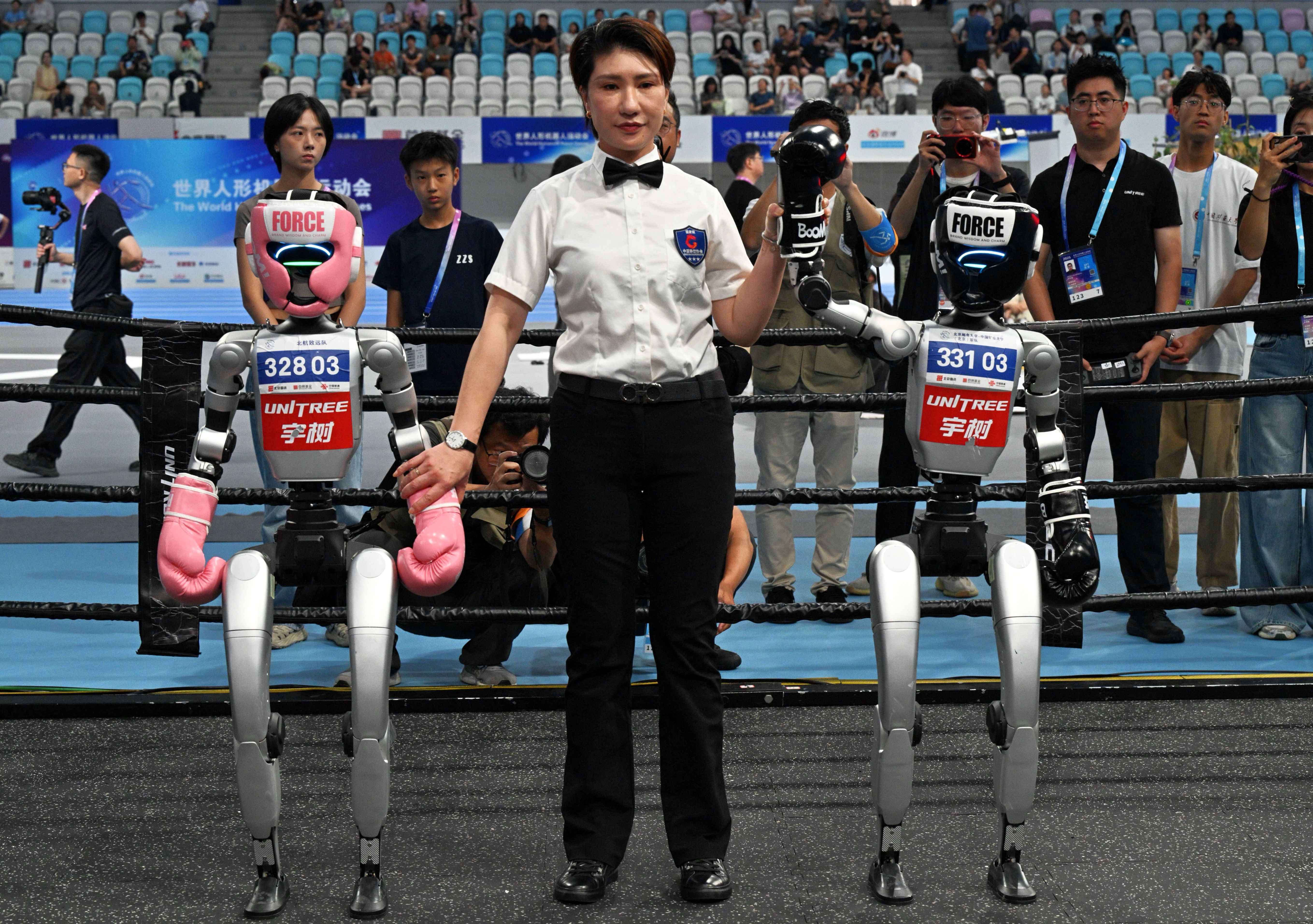 A referee announces the winner in the free combat style event during the World Humanoid Robot Games in Beijing on August 15, 2025. (Photo by Adek Berry/AFP Photo)
