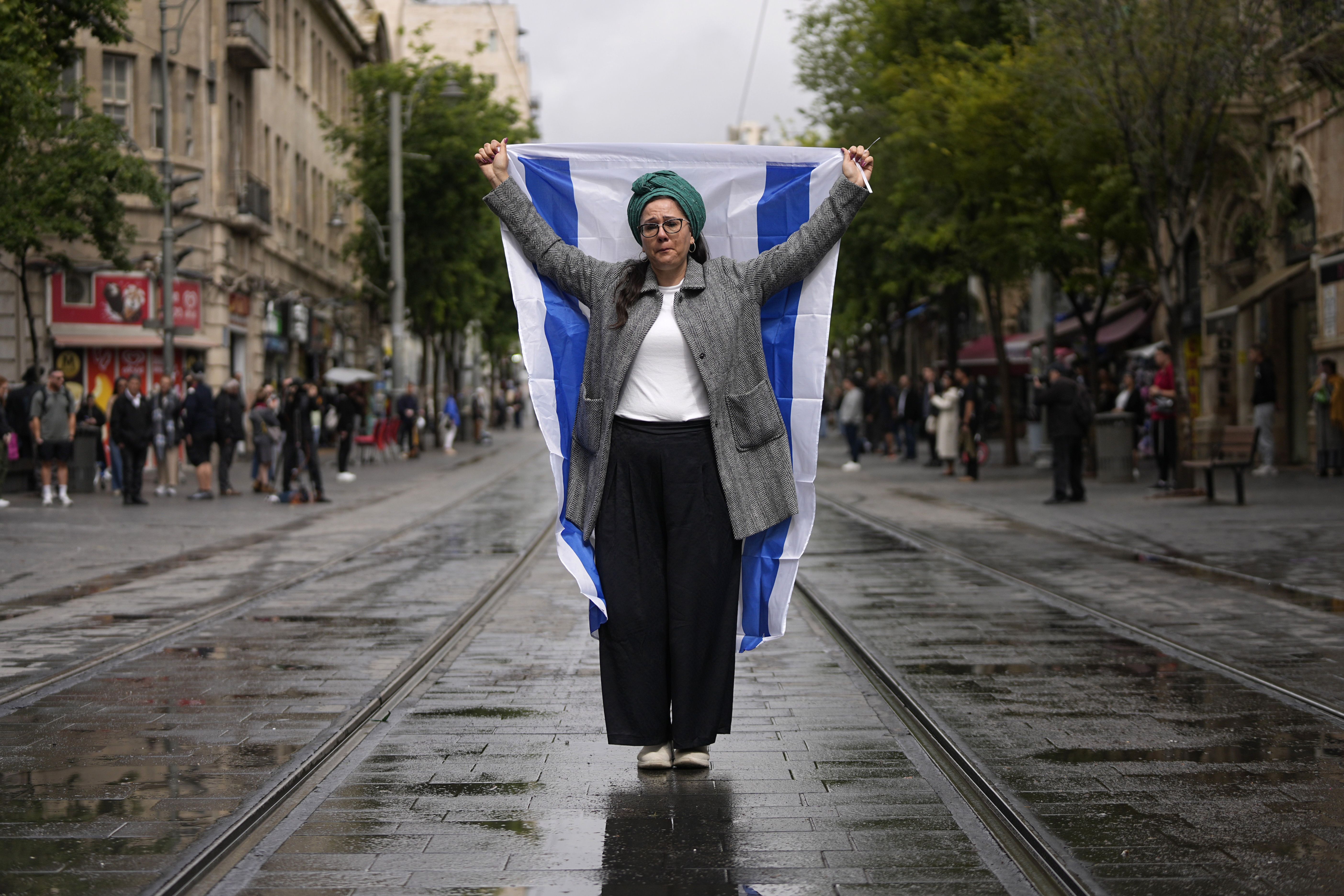 A woman stands still with an Israeli flag during a two-minute siren in memory of victims of the Holocaust, in Jerusalem, Monday, May 6, 2024. (Photo by Ohad Zwigenberg/AP Photo)