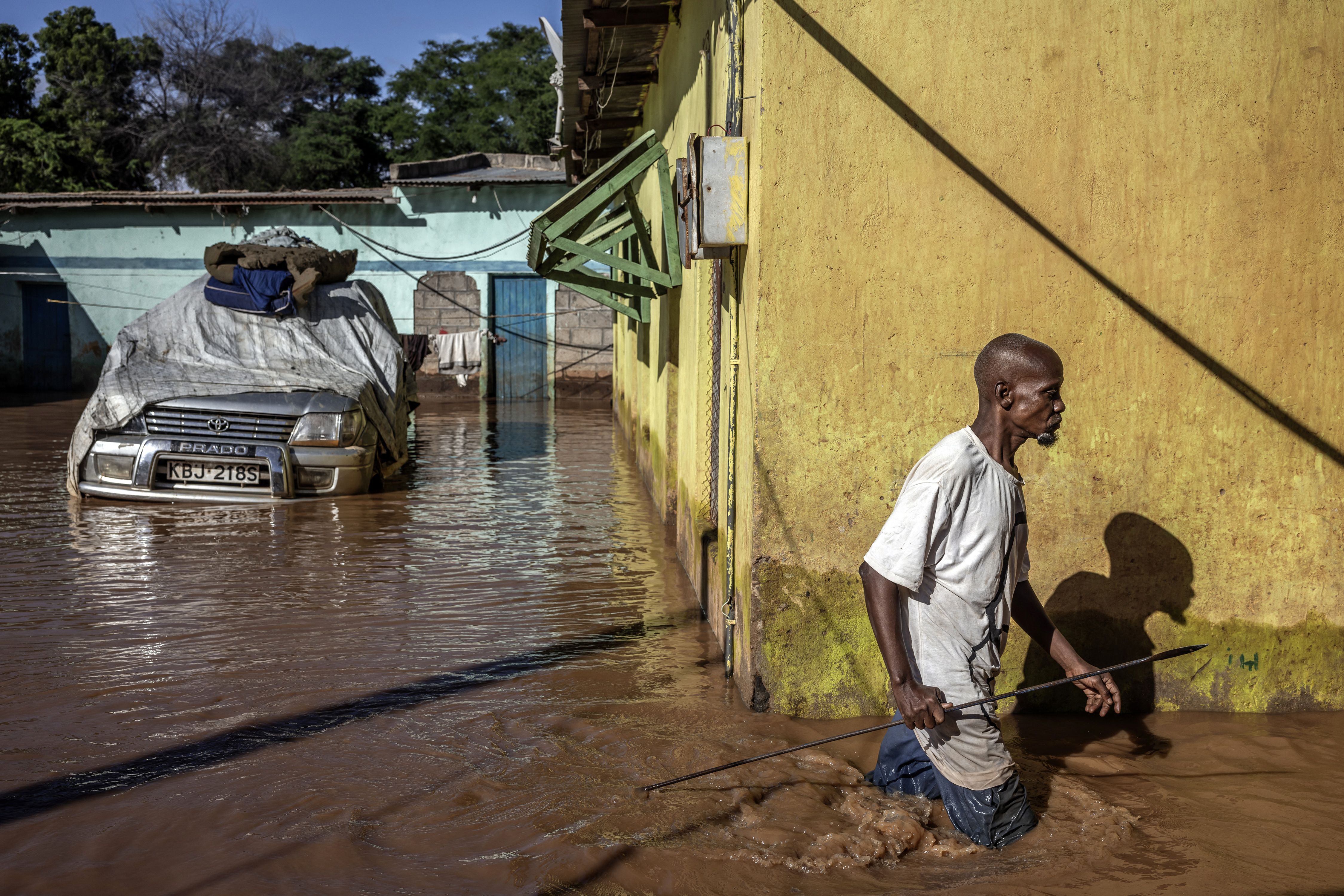 Boya Ali Karani, 64, wades through flood waters in the area where he used to live after being displaced by floods at an inundated area in Garissa, on May 9, 2024. Kenya is grappling with one of its worst floods in recent history, the latest in a string of weather catastrophes, following weeks of extreme rainfall scientists have linked to a changing climate. At least 257 people have been killed and more than 55,000 households have been displaced as murky waters submerge entire villages, destroy roads and inundate dams. (Photo by Luis Tato/AFP Photo)