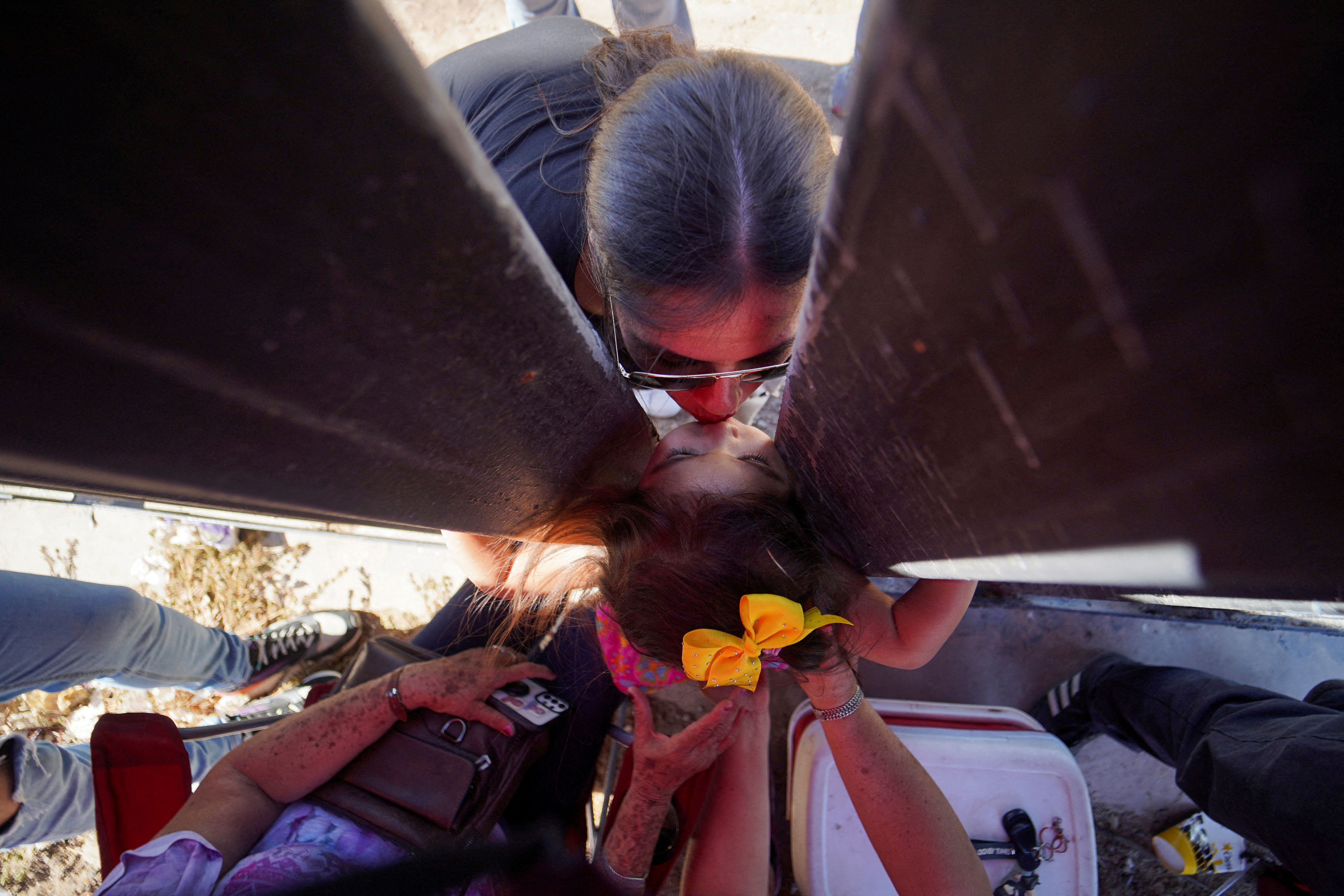A member of the Orduno Castro family, who lives in North Carolina and can't cross into Mexico, kisses her niece during a family meeting at the border fence that separates Mexico and the U.S., ahead of Mother's Day, as seen from Mexicali, Mexico, on May 6, 2024. (Photo by Victor Medina/Reuters)